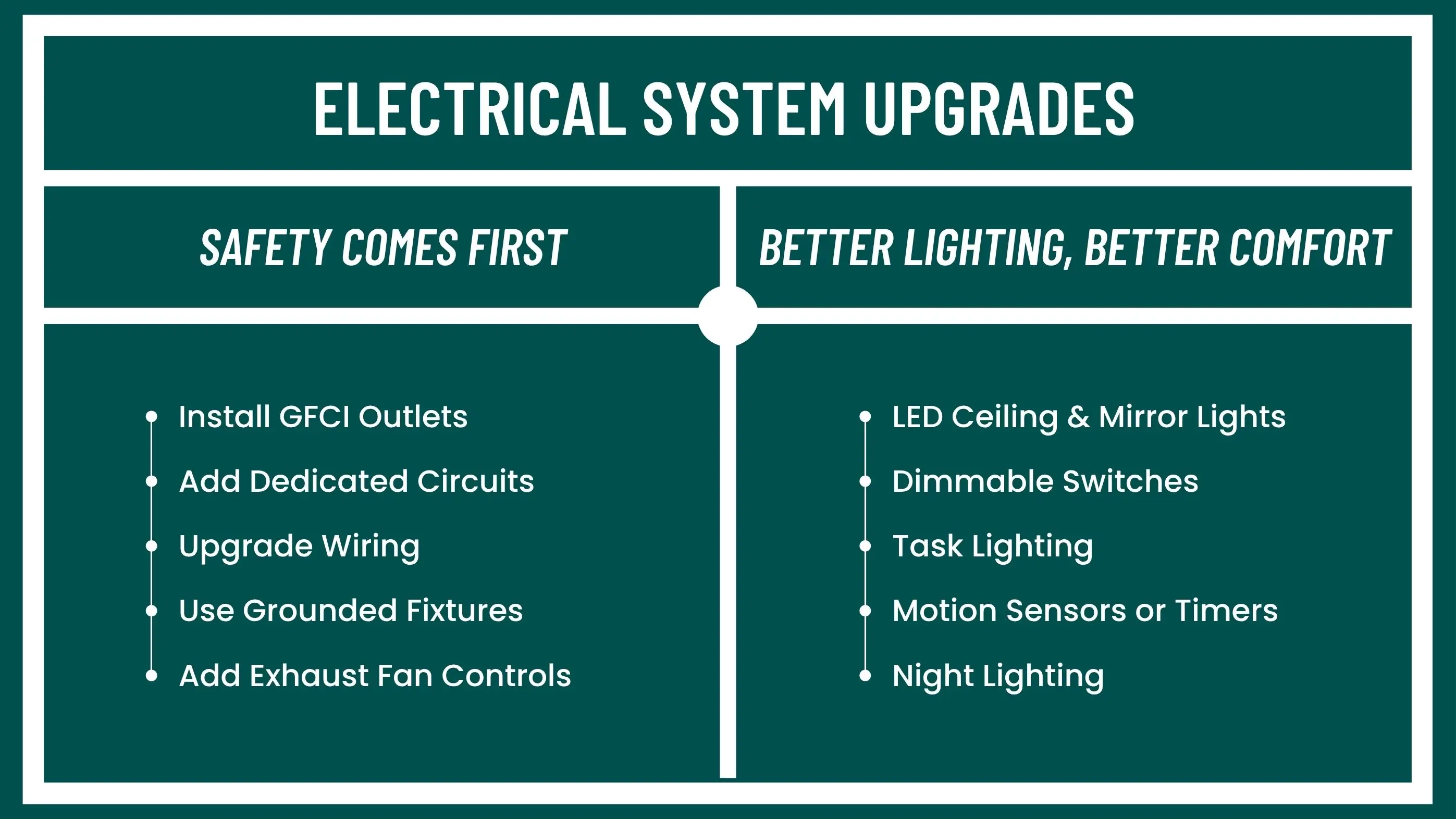 Water and electricity don’t mix well. Adding GFCI outlets, grounded circuits, and safe wiring reduces the risk of shocks and fire hazards.