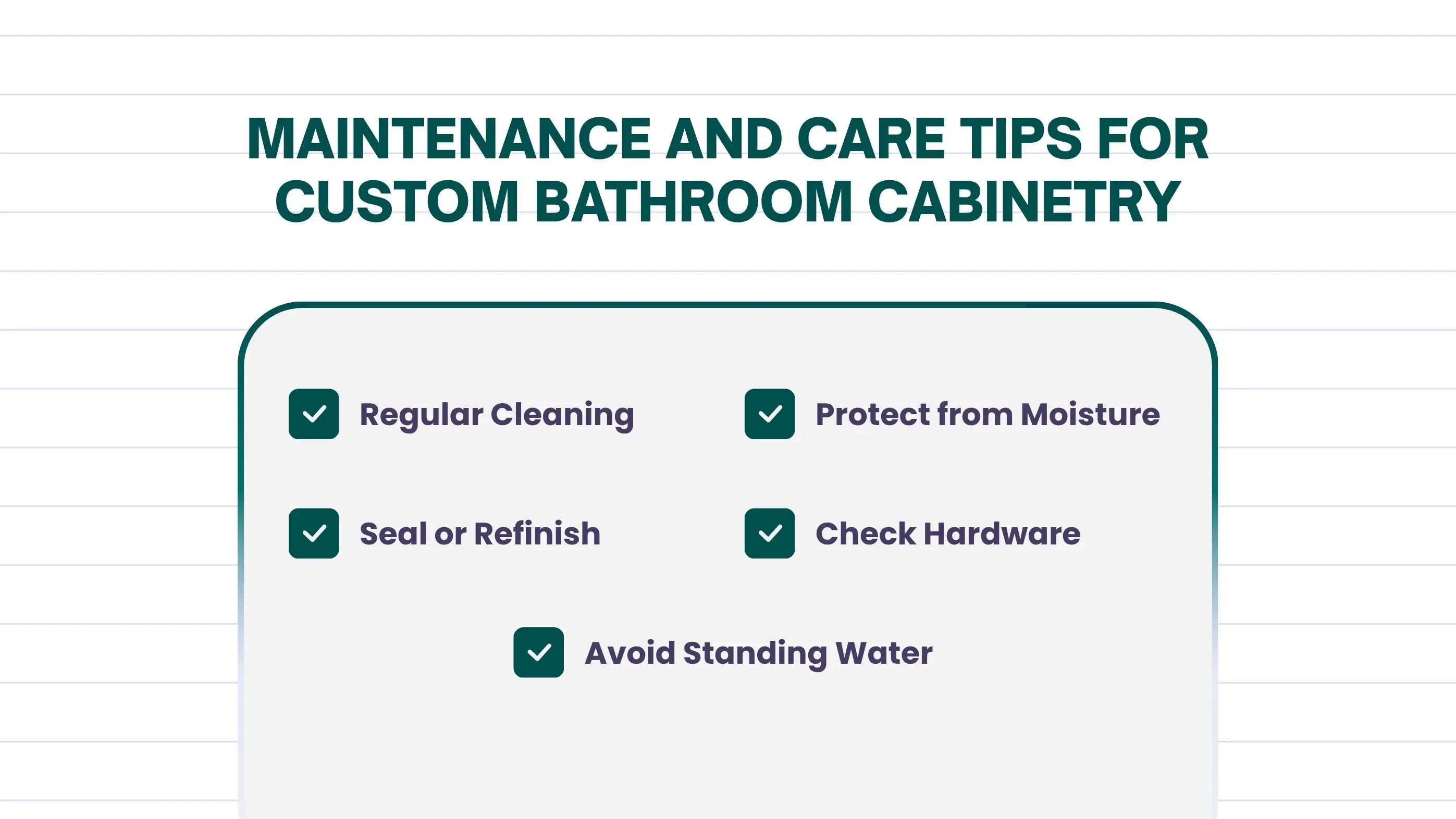 Once your custom bathroom cabinets are installed, regular care keeps them looking new for years. Bathroom spaces deal with constant moisture, so proper maintenance prevents swelling, stains, and wear.