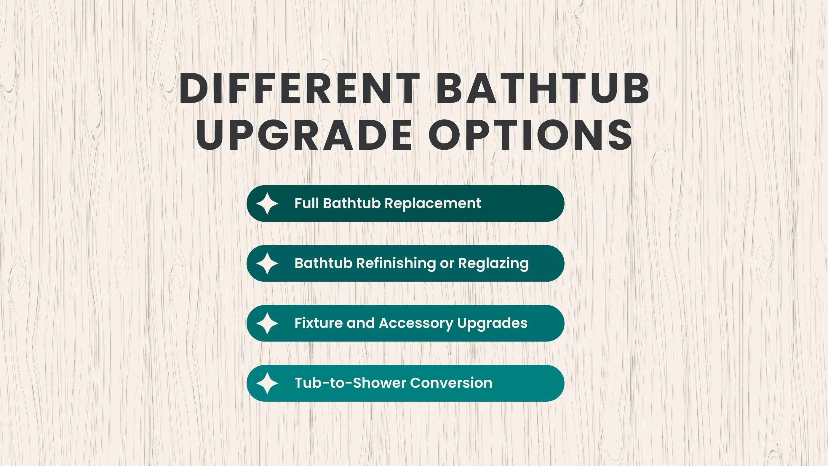 Upgrading your bathtub doesn’t always mean replacing the entire unit. Depending on your budget and the condition of the current tub, you can choose from several upgrade methods.