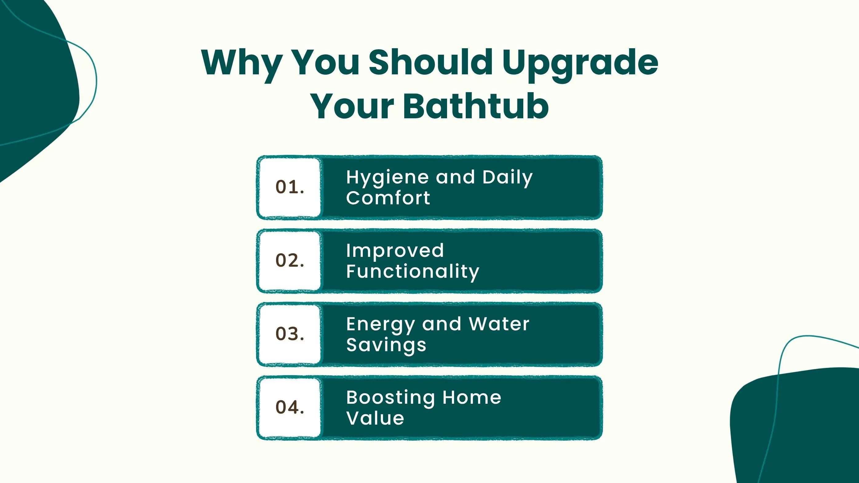 Upgrading your bathtub improves hygiene by eliminating cracks and stains, making your bathroom more comfortable and easier to clean. It also enhances your bathing experience with modern features like better water flow and slip-resistant surfaces. Plus, a fresh bathtub can increase the value of your home, making it a smart long-term investment.