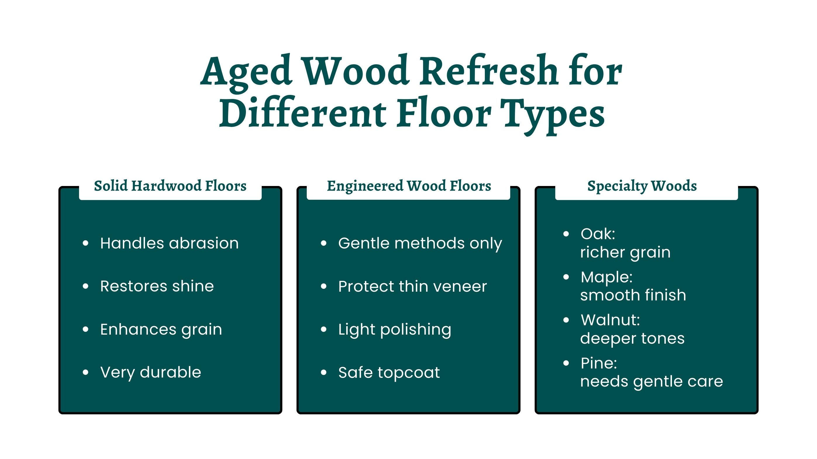Each type of wood flooring responds differently to the refresh process. Understanding how solid hardwood, engineered wood, and specialty wood types react helps ensure safe and effective results.