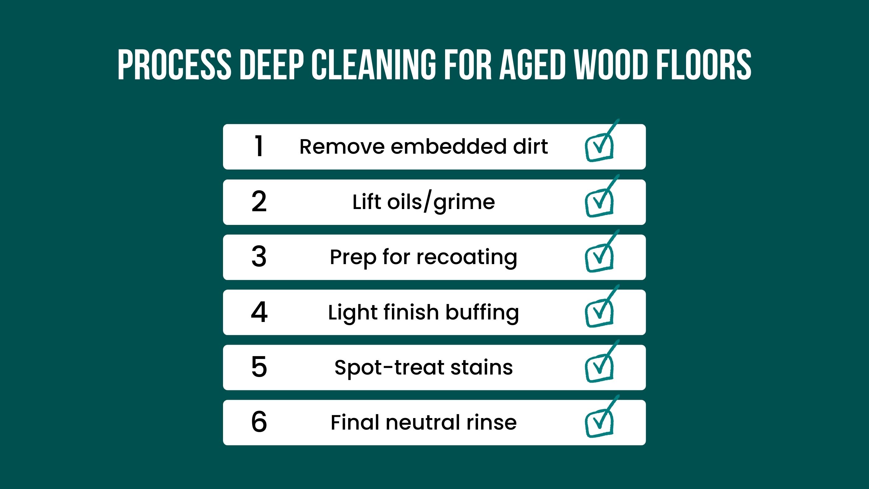 Deep cleaning is the first and most important step in refreshing aged wood floors. Over the years, hardwood collects layers of dirt, oils, cleaning product residue, polish buildup, and grime that settle into the surface and make the floor look dull. Removing this buildup restores clarity, brings back natural color, and prepares the wood for polishing or recoating. Here are few steps: