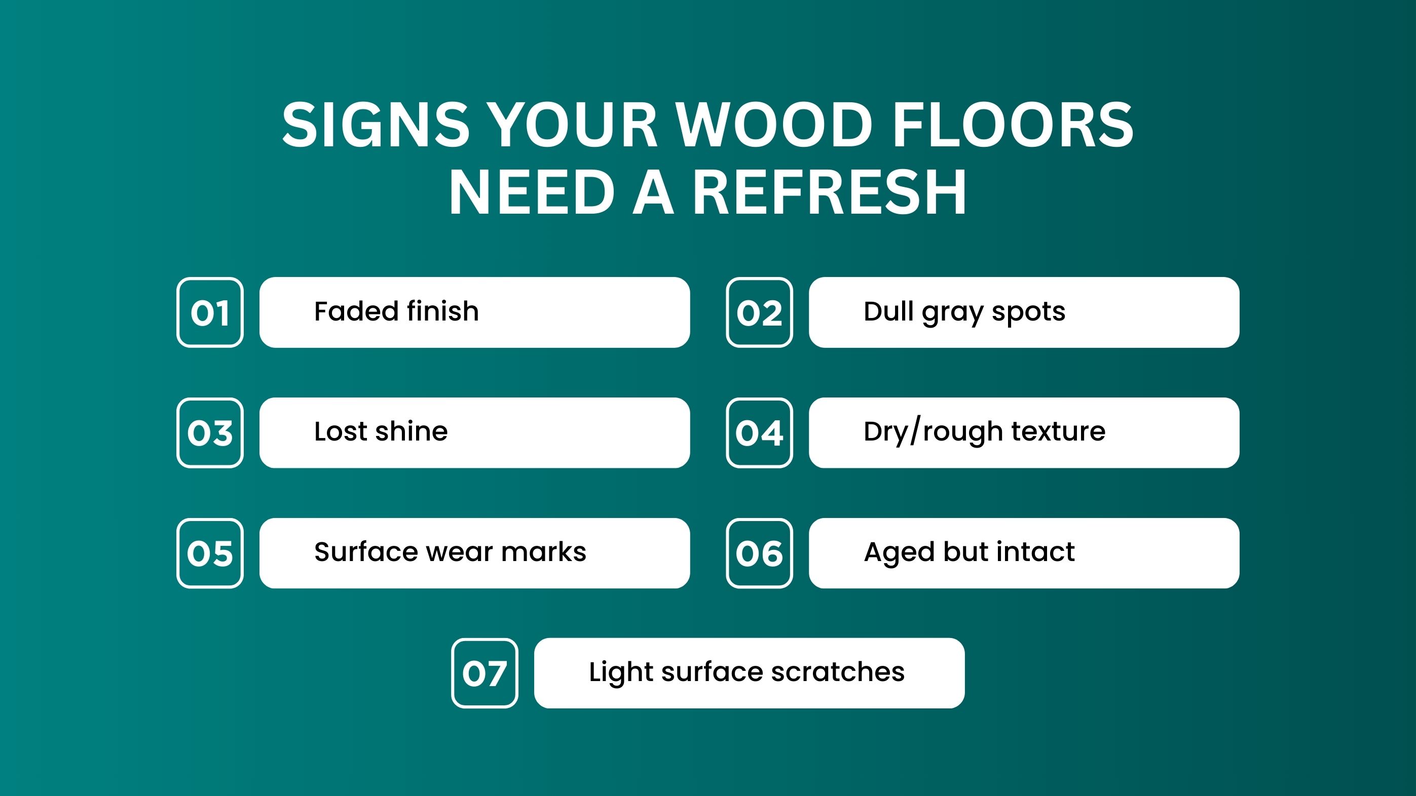 If the floor no longer reflects any light, even after cleaning, it means the topcoat is gone. A refresh restores the glossy or satin finish.
