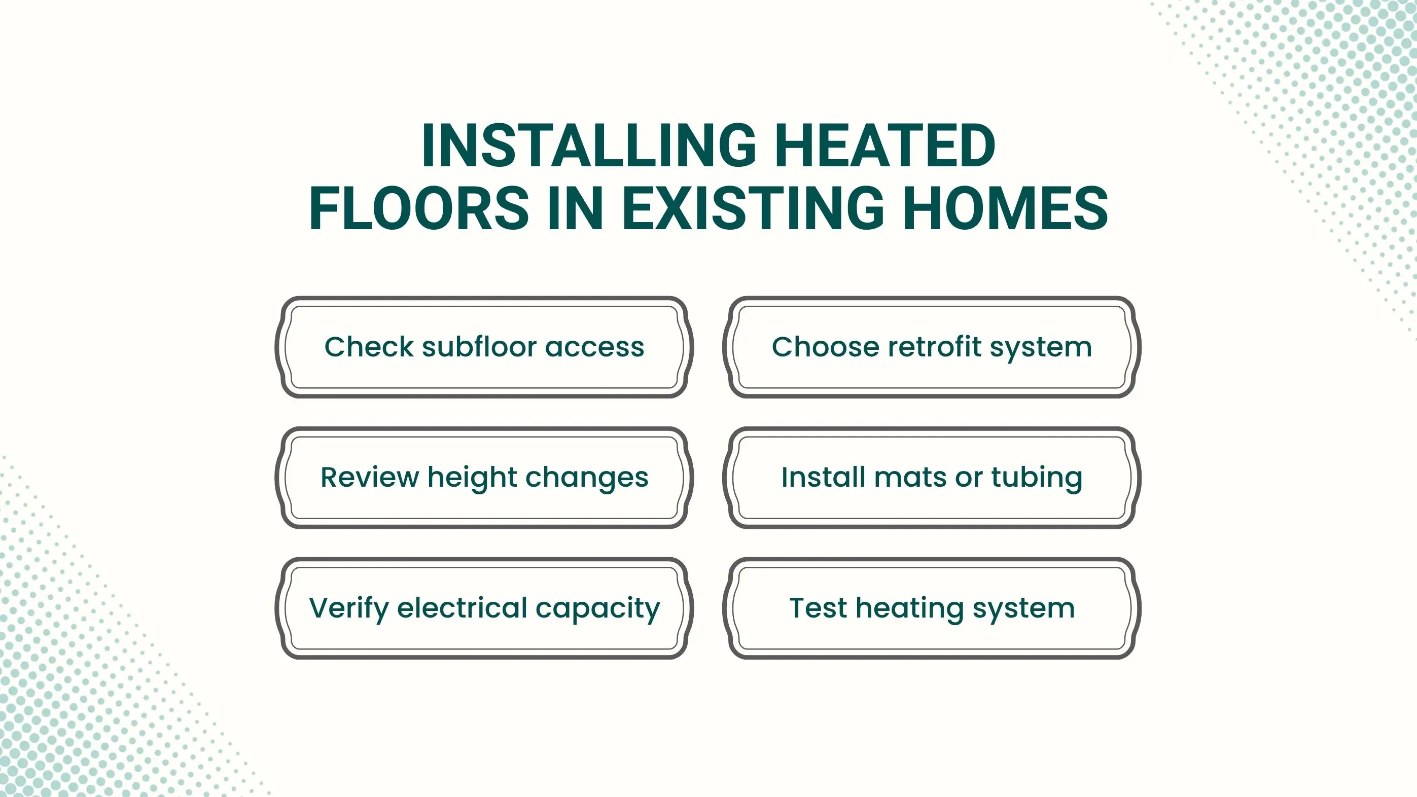 Unlike new construction, where systems are embedded early, a retrofit installation must account for floor height build-up, electrical load requirements, and how easily the installer can reach the subfloor.