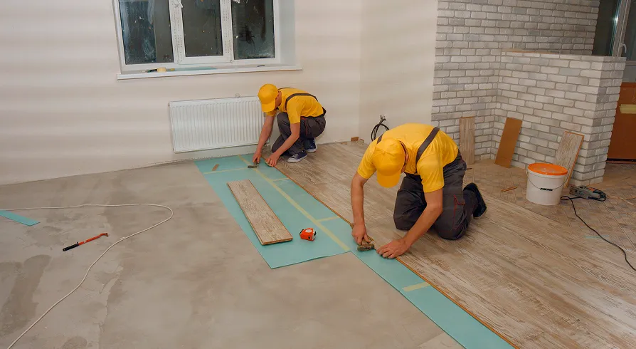 Furniture is moved, old flooring is removed, and the subfloor is cleaned and leveled. For moisture‑sensitive materials like hardwood or vinyl, installers may add underlayment or vapor barriers.