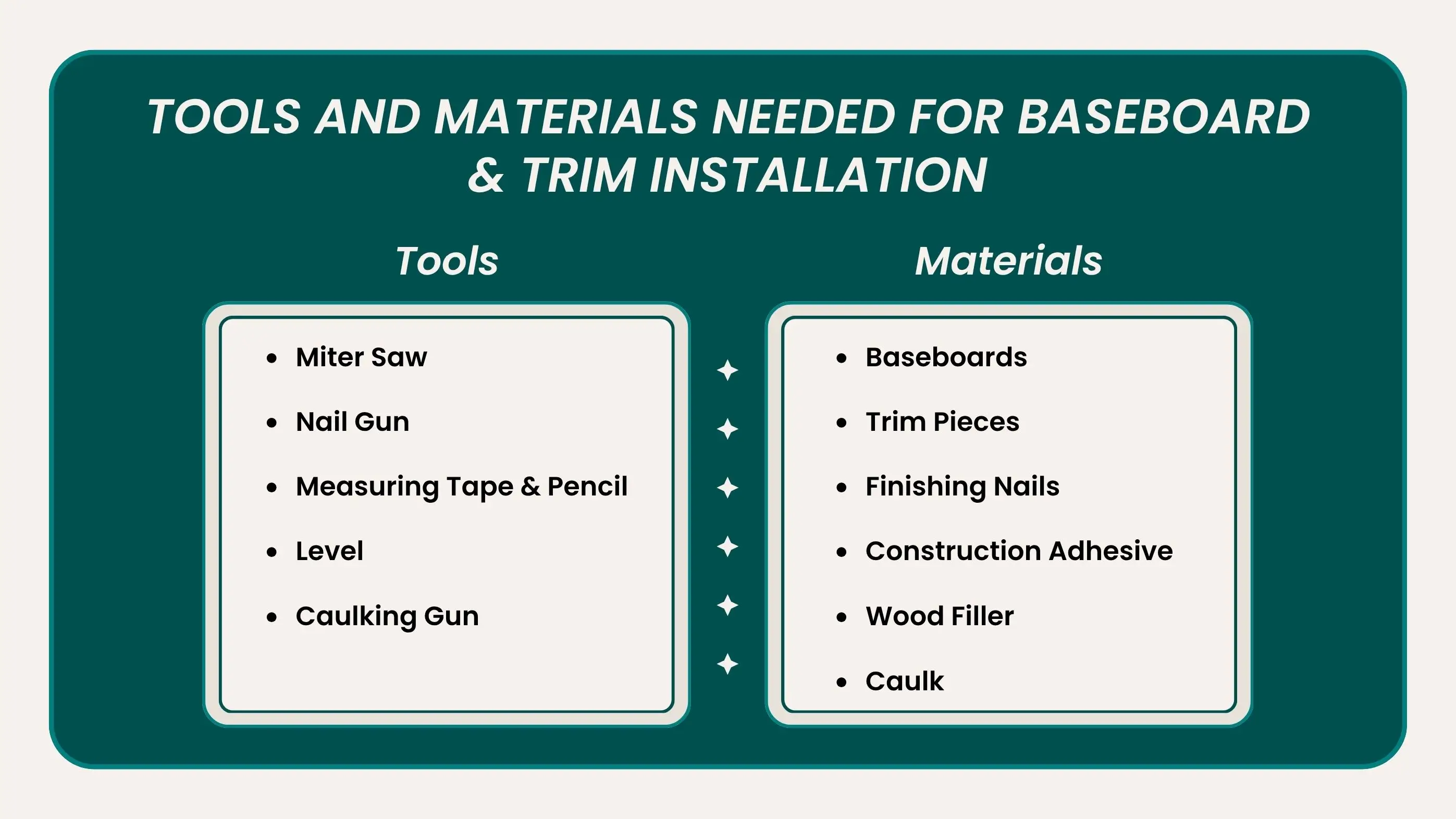 These key materials help secure the trim, hide gaps, and create a smooth, durable, and finished look after installation.