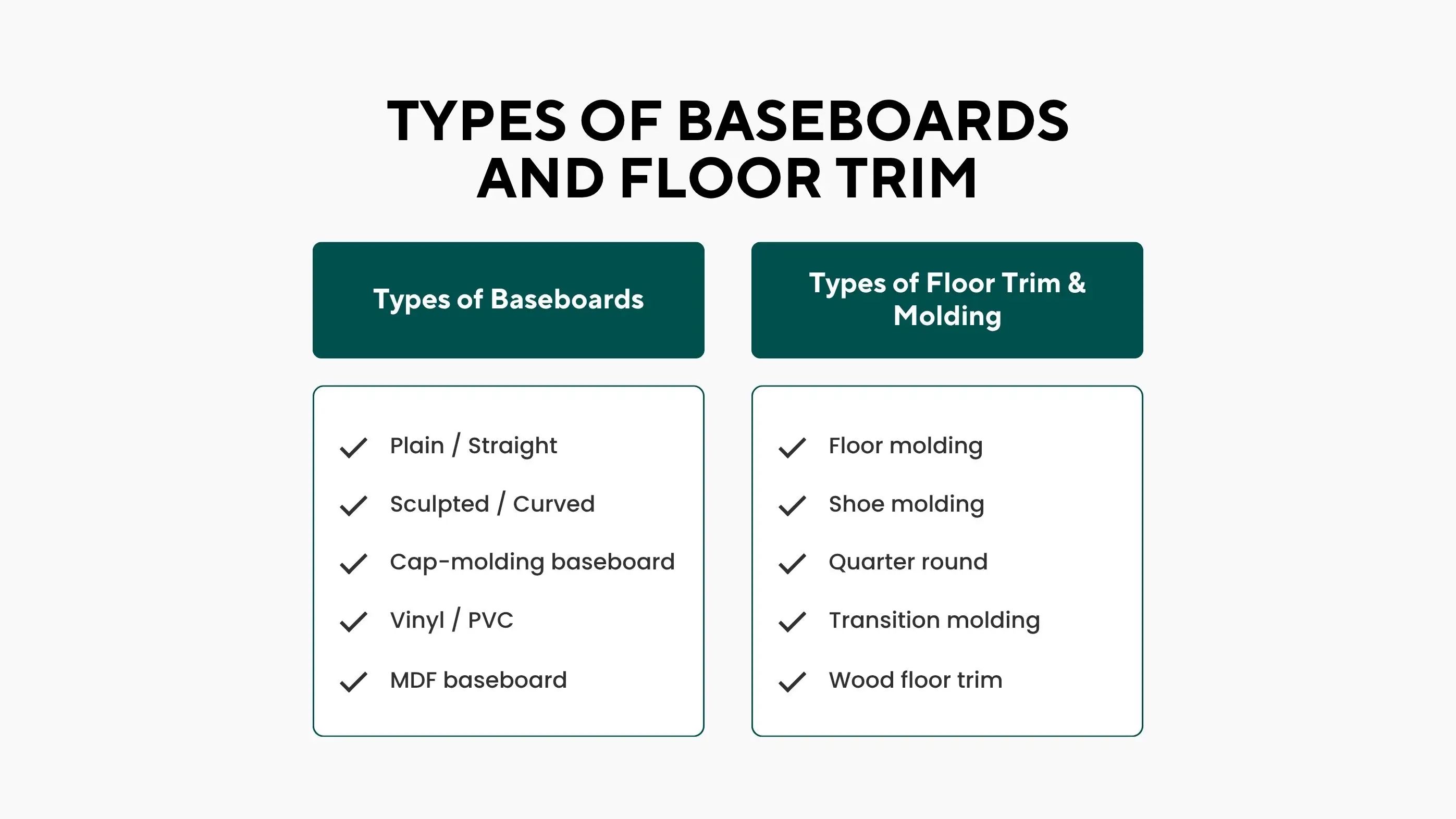 Before installing new baseboards or floor trim, homeowners must choose the right style and material. Each type has a different look, installation requirement, and level of durability. Understanding the options helps you select a trim that fits your flooring, room style, and budget. Below are the most common types of baseboards, followed by essential floor trim pieces used during installation.