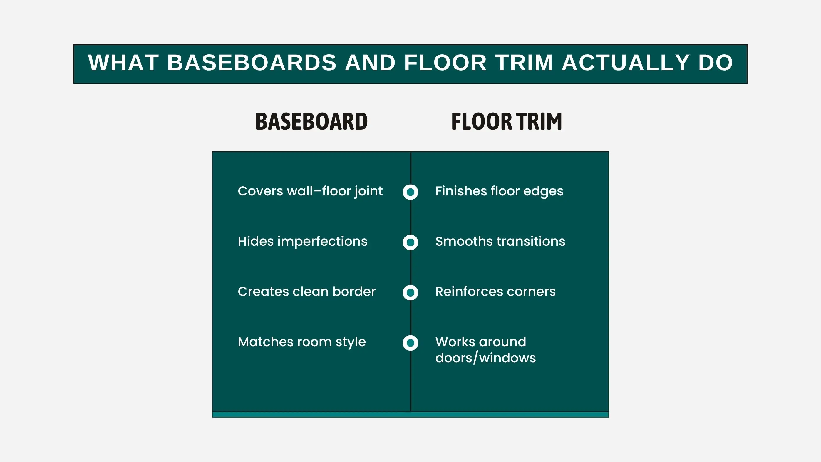 Baseboards are installed where the wall meets the floor. They cover the expansion gap, protect the wall from scuffs, and give the room a finished, clean look. Here are the main styles homeowners can choose from: