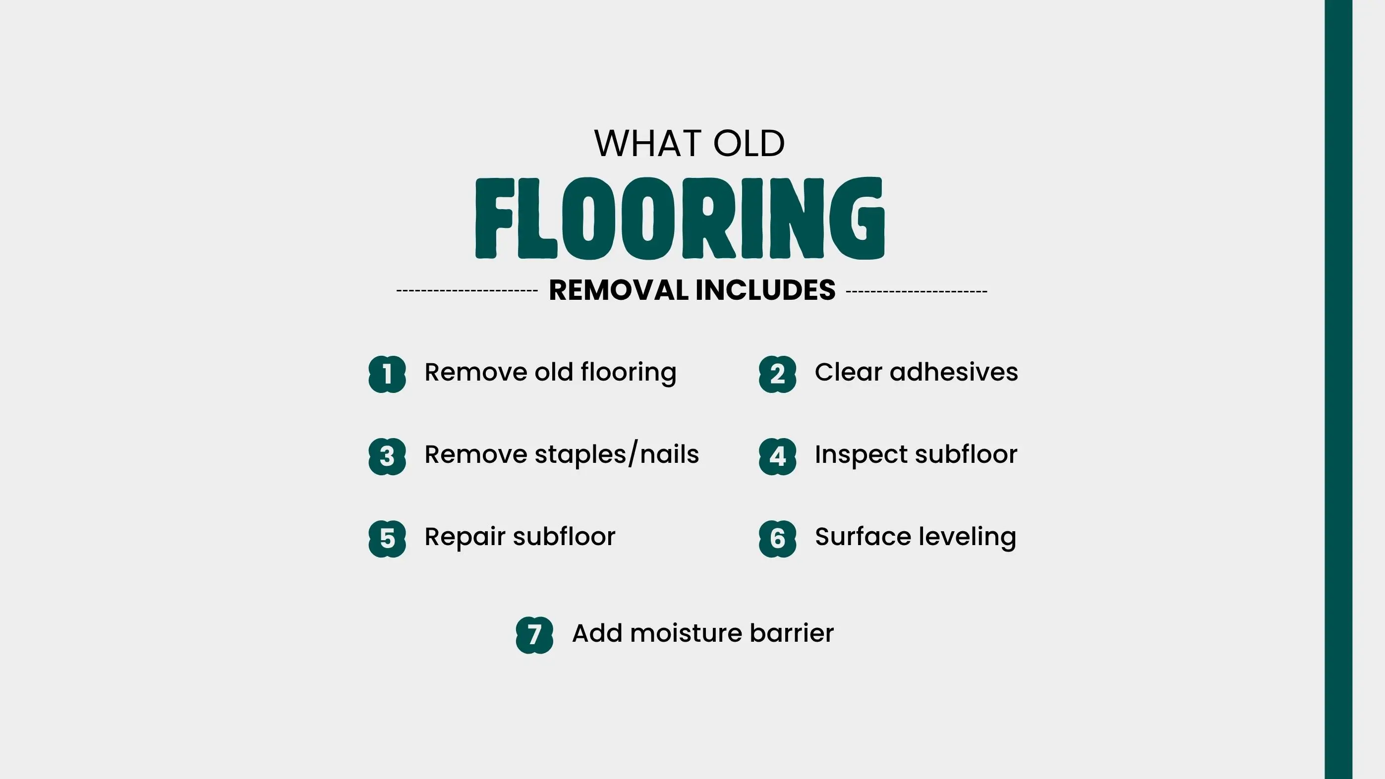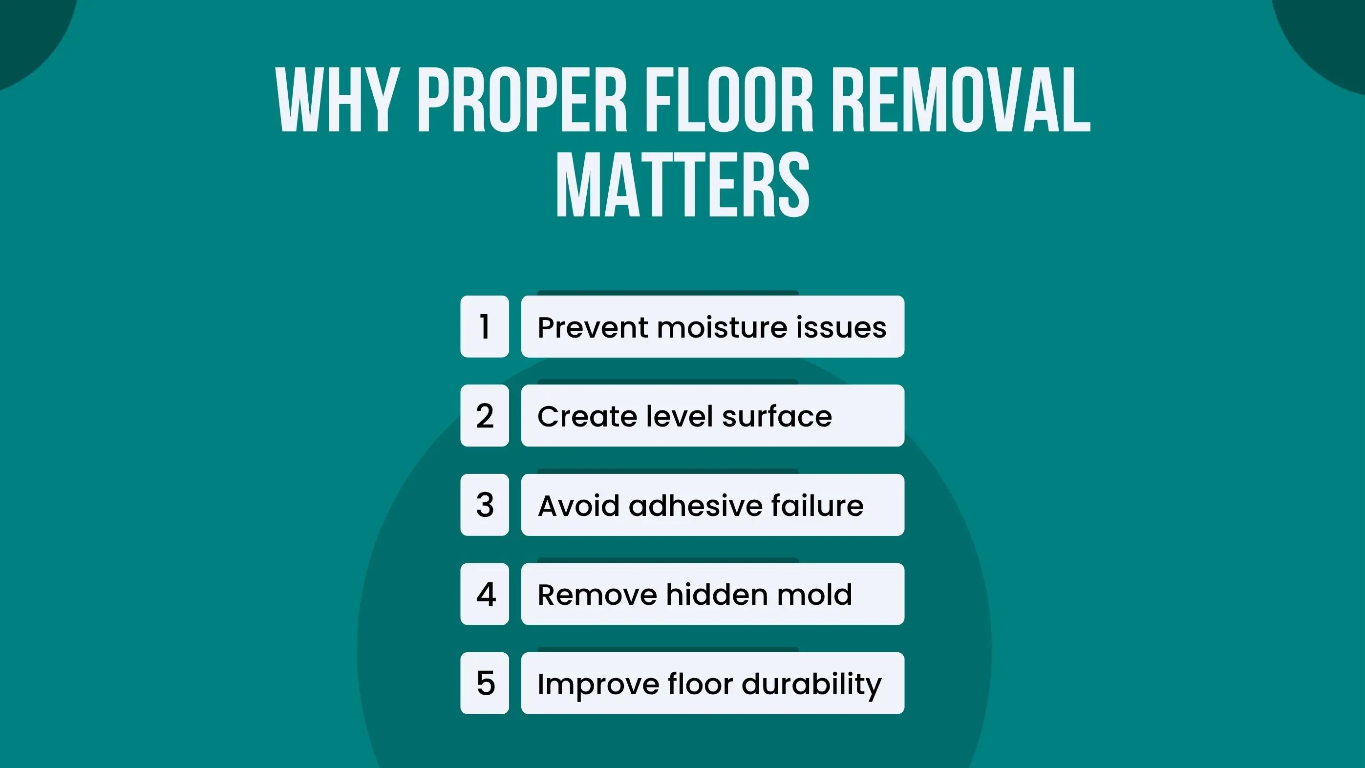 Removing the old floor exposes hidden moisture pockets, damp subfloors, or mold growth beneath older materials. Once exposed, installers can dry, seal, and repair the area properly. This prevents future issues such as warping, cupping, swelling, and adhesive failure in the new flooring.