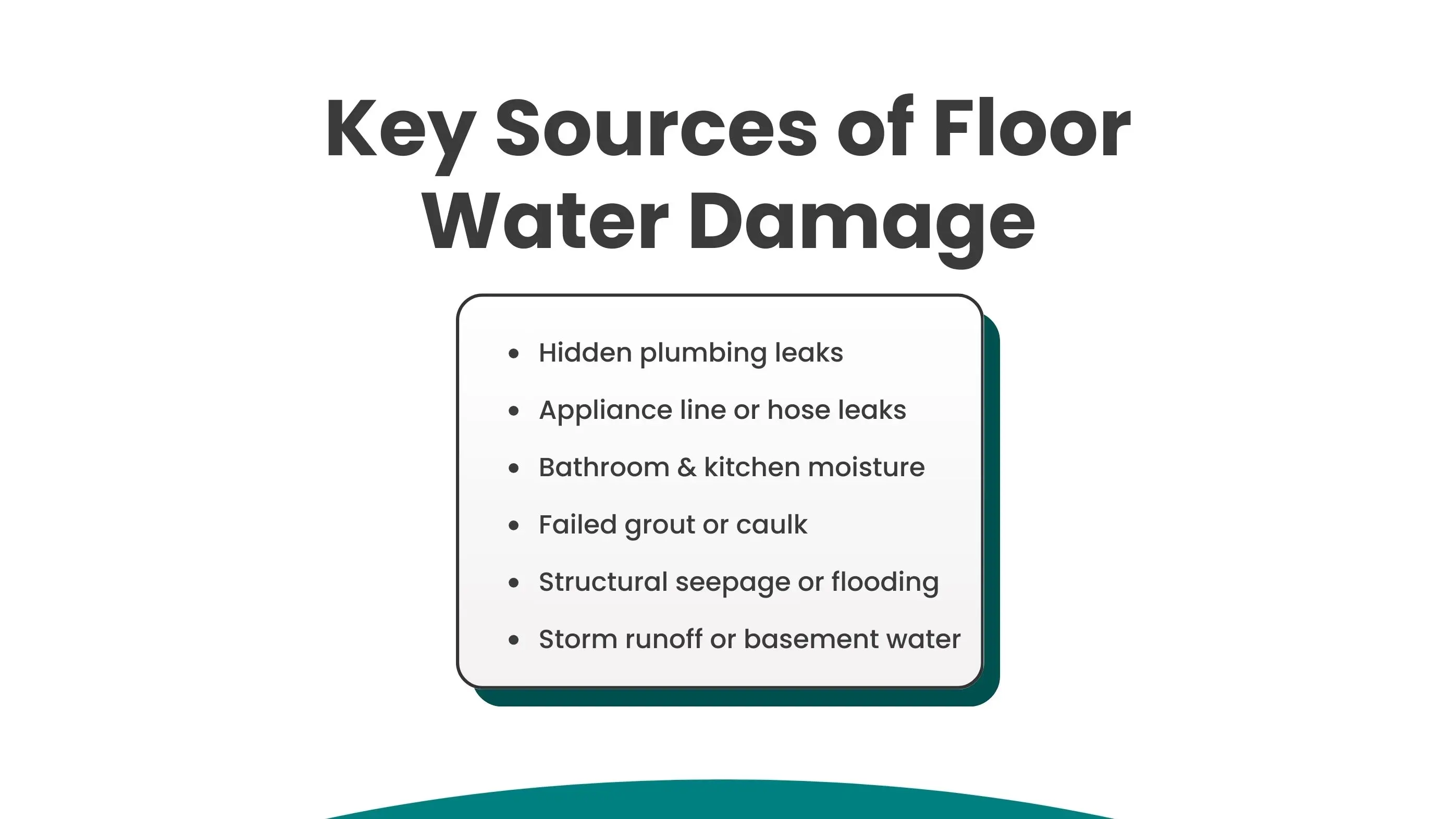 Many cases of water-damaged floors come from slow or hidden leaks around household plumbing and water-using appliances. Common sources include: