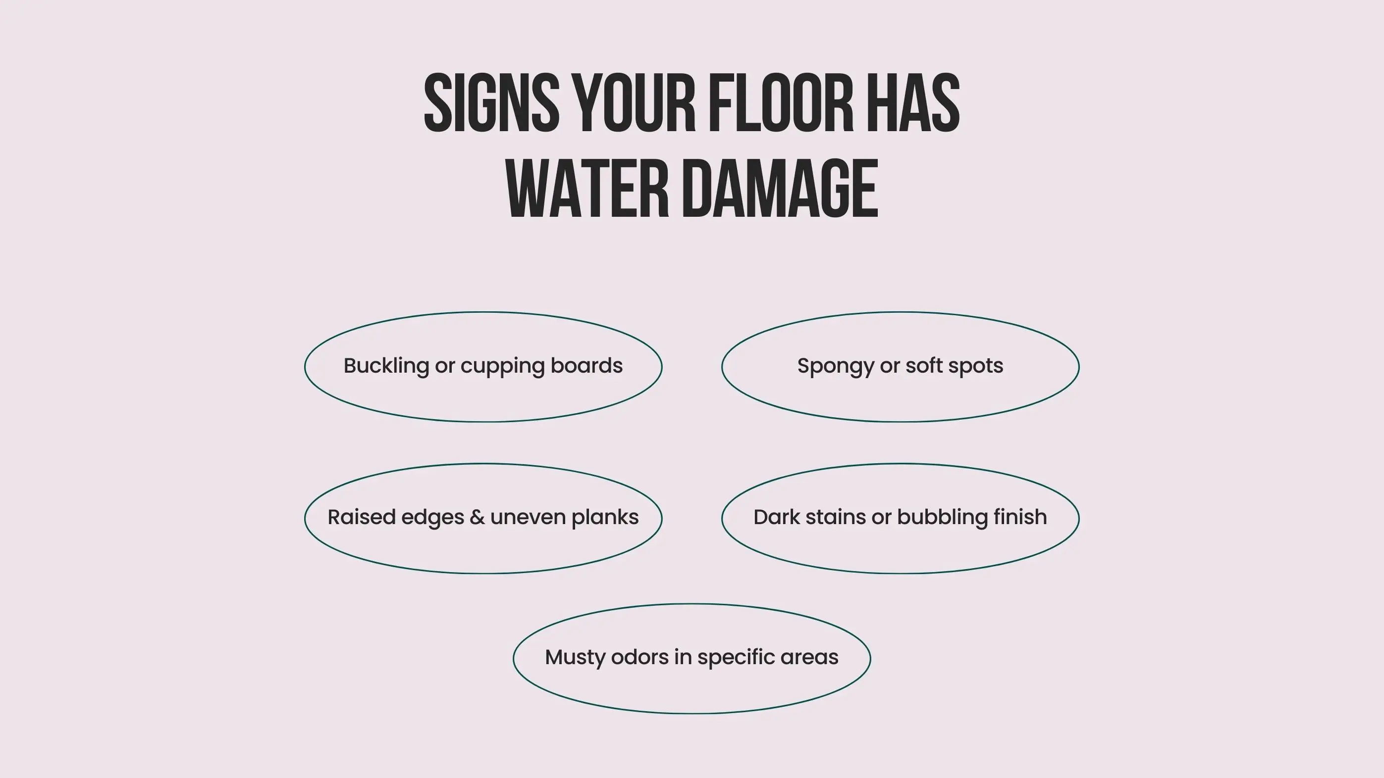 Water damages flooring when it seeps into seams, subfloors, and structural layers. Once moisture gets inside wood, laminate, vinyl, or carpet padding, it weakens fibers and breaks down adhesives that keep the floor stable. This can cause: