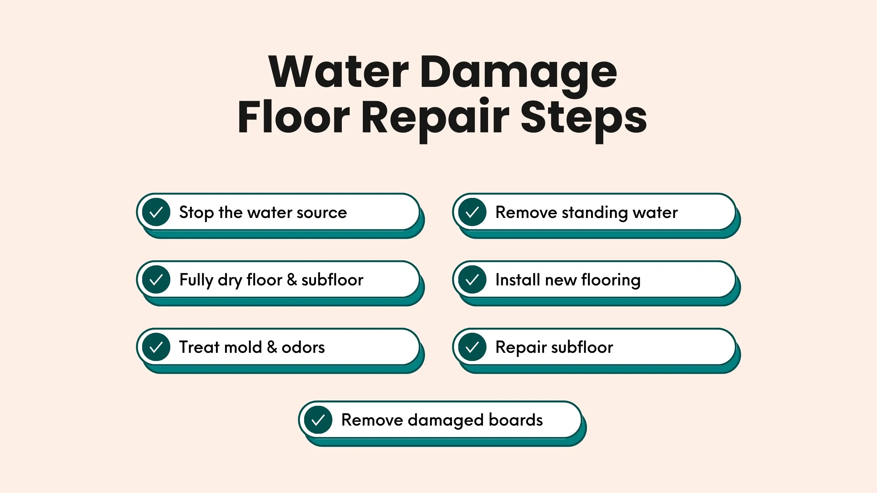 A structured repair plan ensures water-damaged floors are restored safely and permanently. Following each step in sequence prevents hidden moisture from causing new problems such as mold, subfloor rot, and early flooring failure. Each stage below supports the next to guarantee a stable, long-lasting result.