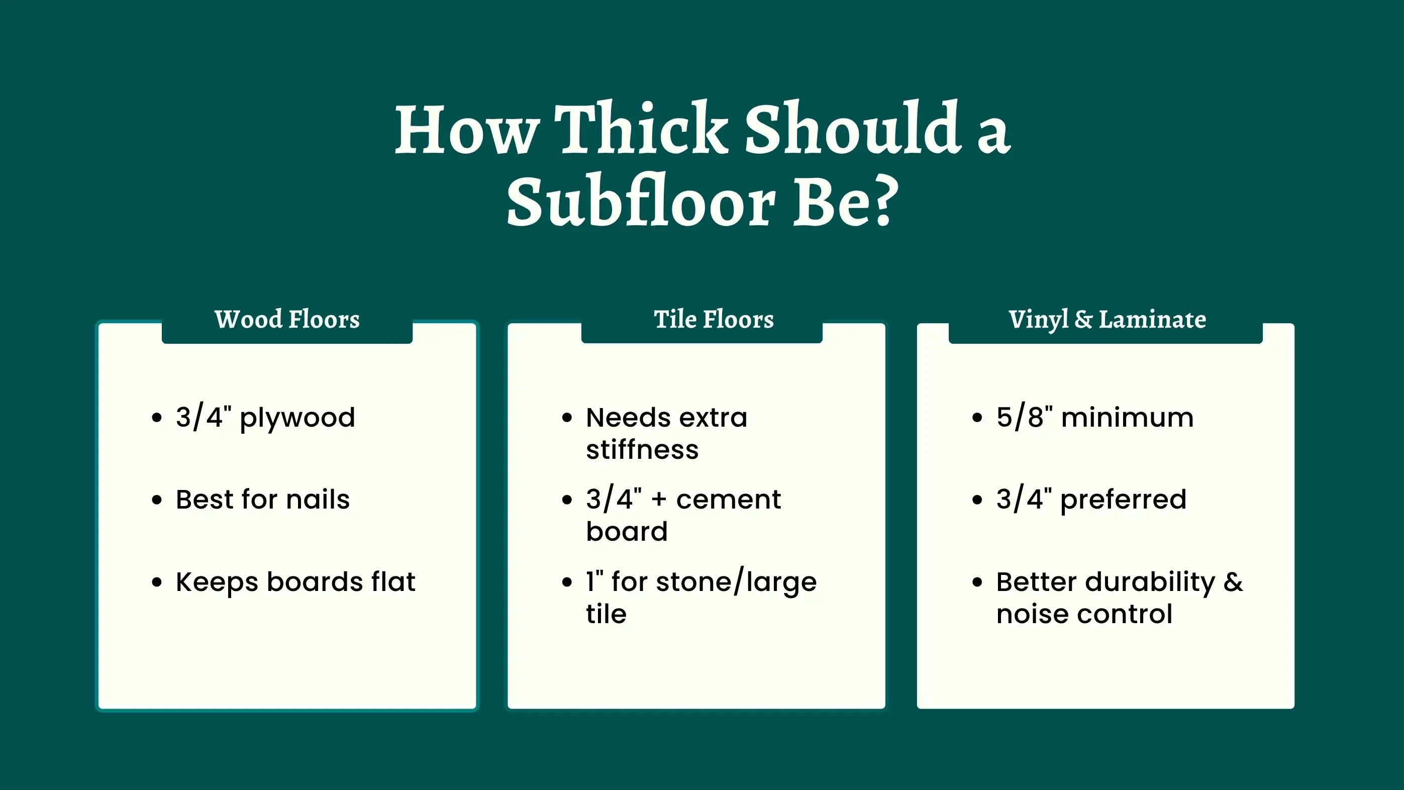 Most homes use 3/4-inch plywood for a strong, stable subfloor. However, smaller rooms or tight joist spacing may allow 5/8-inch, while tile or stone flooring may need 1-inch thickness for added strength.