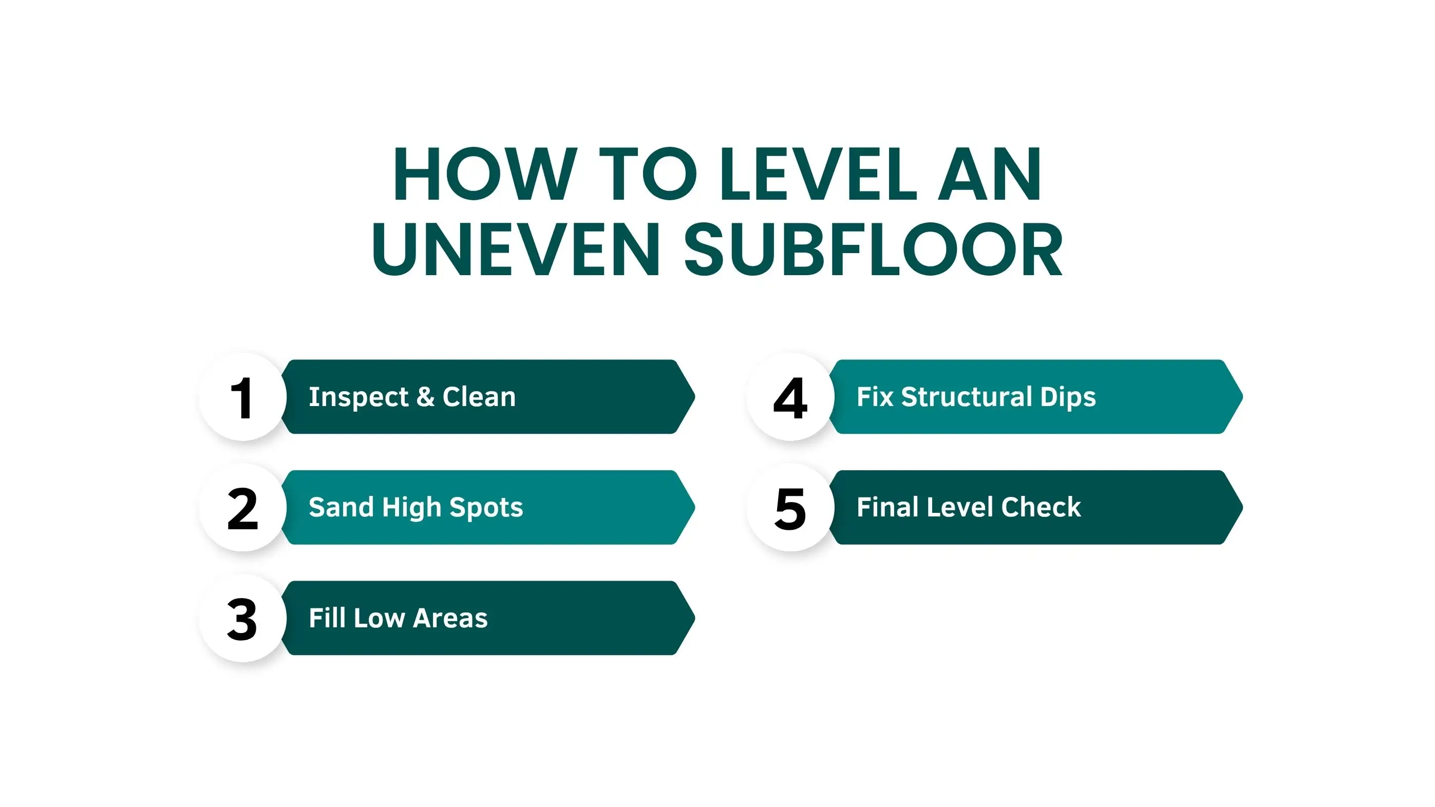 Begin by removing all dust, debris, and nails from the subfloor. A clean surface helps leveling materials bond properly. Use a long level or straightedge to identify all high and low spots.