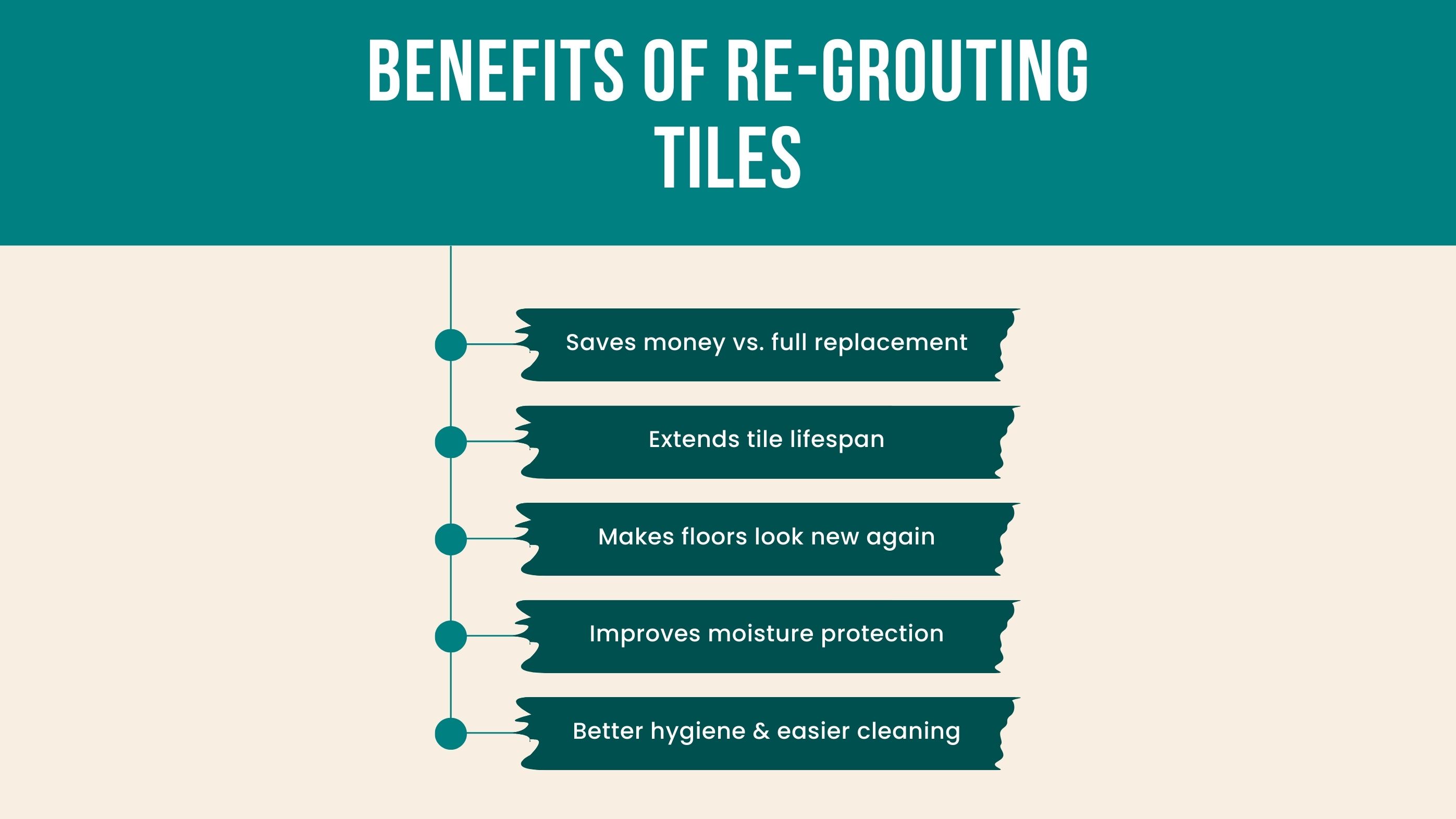 Professional re-grouting brings both functional and aesthetic benefits. It refreshes the appearance of tile floors, protects against moisture damage, and restores the stability and hygiene of tiled surfaces all without the cost of full tile replacement.
