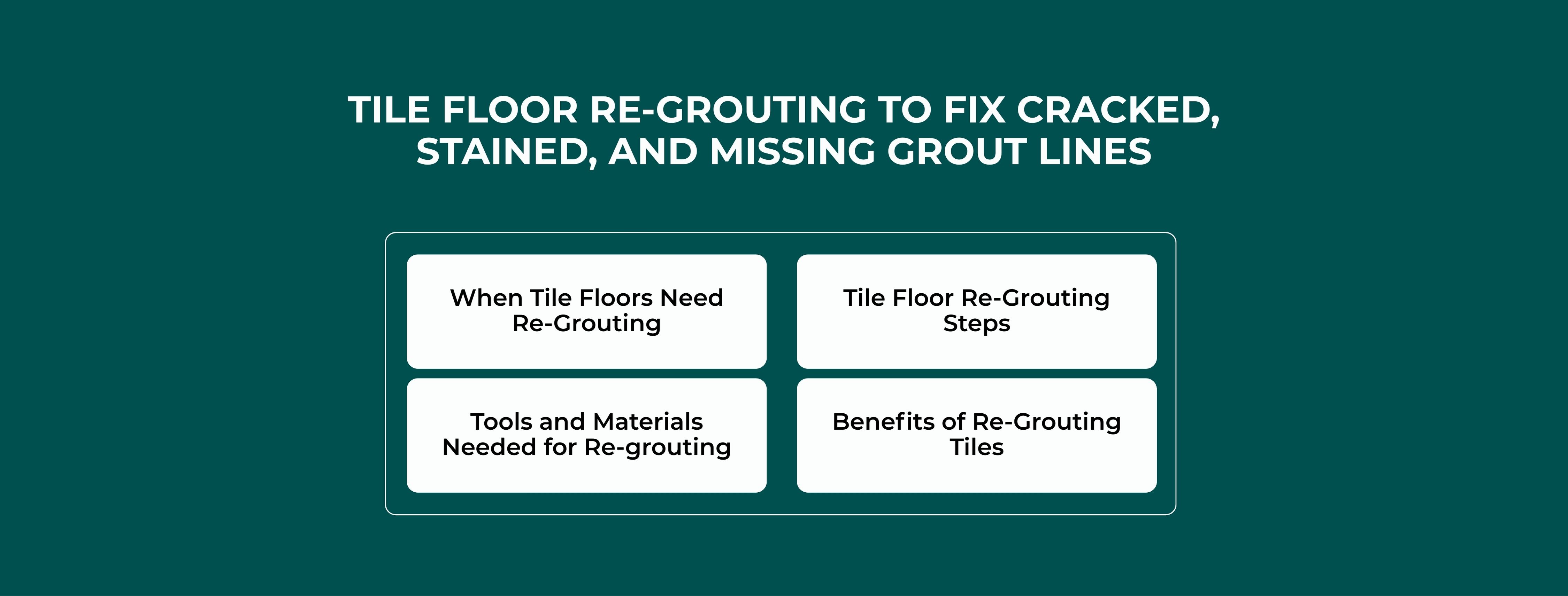 Re-grouting is a restoration process that focuses on replacing the grout lines only, without removing or replacing the existing tiles. Instead of installing a new tile floor, the old, deteriorated grout is carefully removed from between the tiles and replaced with a fresh grout mixture that restores strength, cleanliness, and water protection.