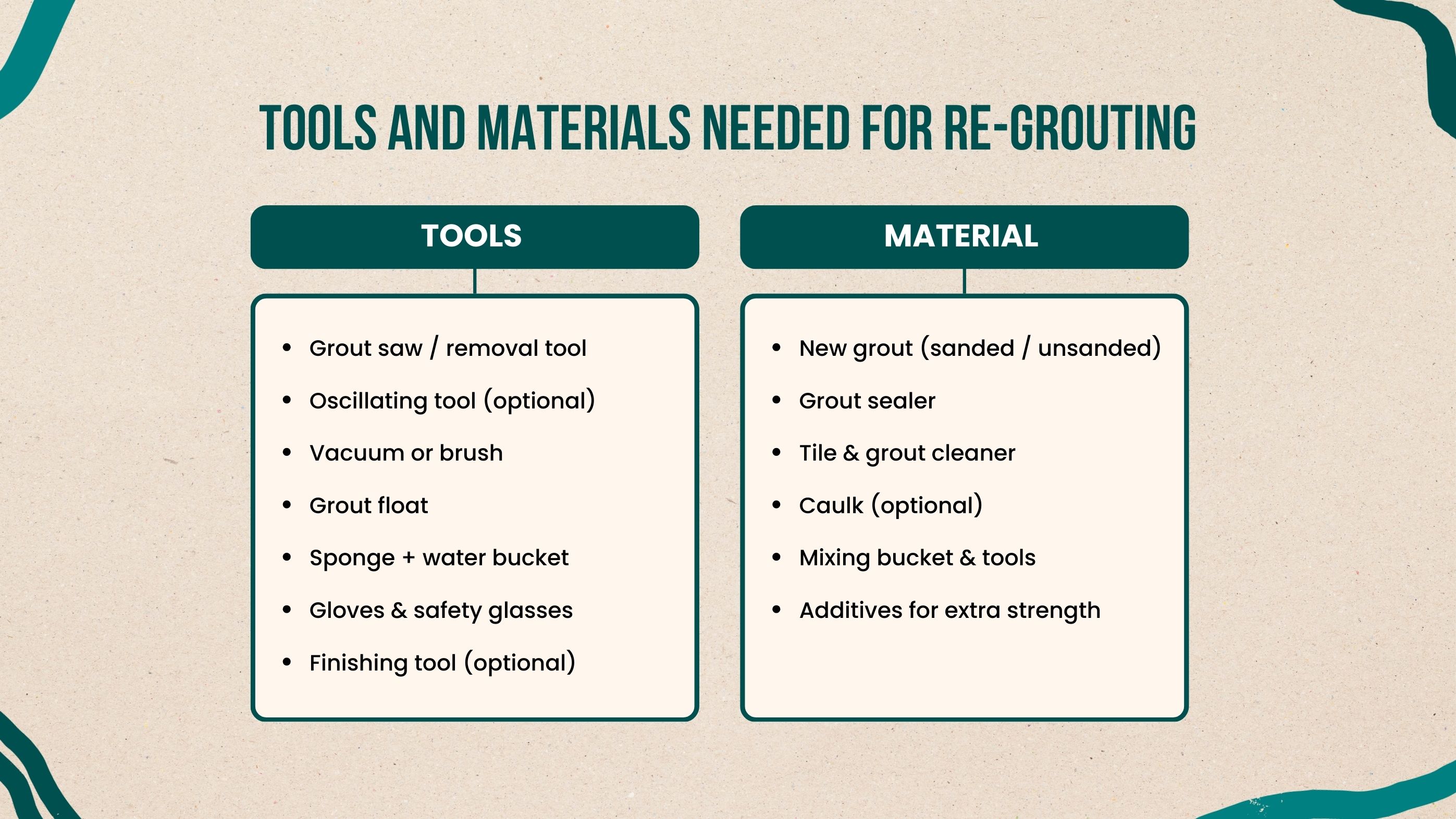 Using the correct tools and materials ensures grout is removed cleanly, applied smoothly, and sealed for long-lasting protection. The right kit helps prevent tile damage, improves adhesion, and creates clean, even grout lines.