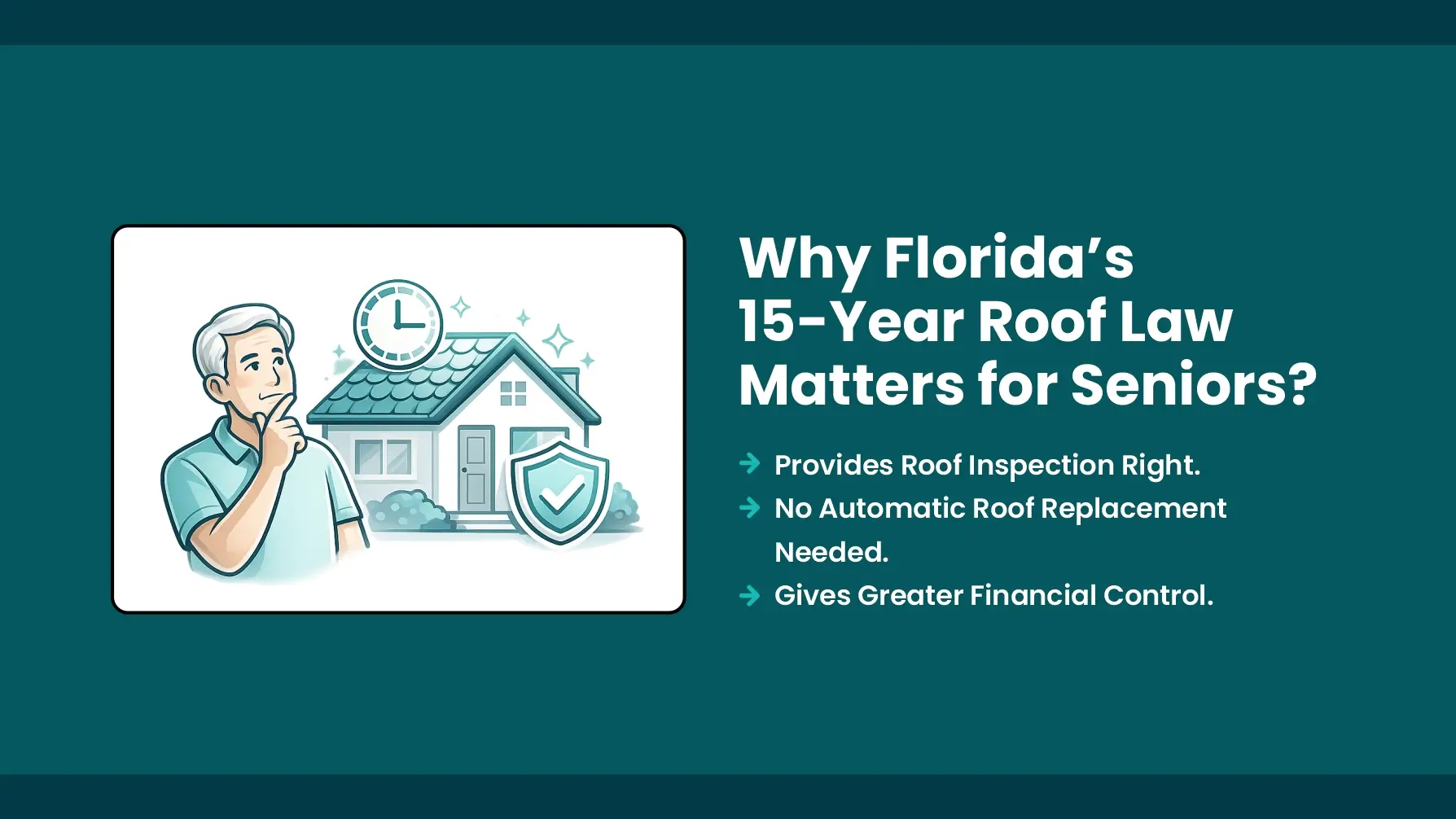 Florida homeowners, especially seniors, must understand the new roof replacement law, as it will help them plan a strategy for the future. Moreover, not every 15-year-old roof needs immediate replacement; it depends on its condition and remaining useful life. Therefore, educating yourself about documentation, inspections, and repair options aids in safeguarding your retirement savings and guarantees your roofing insurance coverage stays effective.