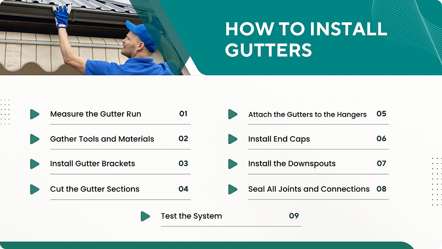 Gutter hangers hold the gutters in place and ensure they stay secure over time. Install them along the fascia with the correct slope, which should be about 1/4 inch for every 10 feet of gutter.