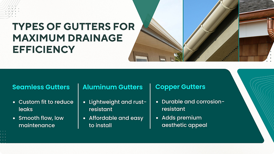 Choosing the right type of gutter is crucial to maximizing your home’s drainage efficiency. Different materials have unique benefits, depending on your needs and home style.