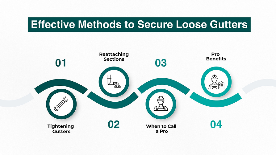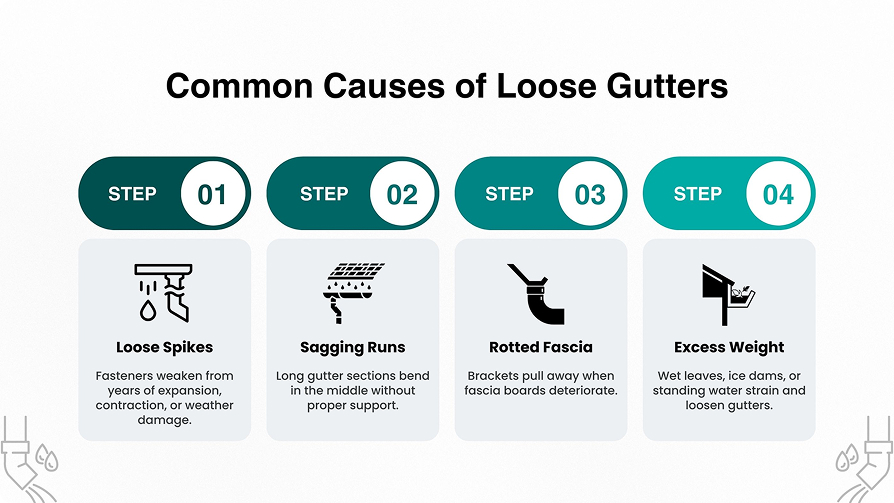 These steps will help stabilize sagging or detached sections, keeping your gutters secure and working properly.