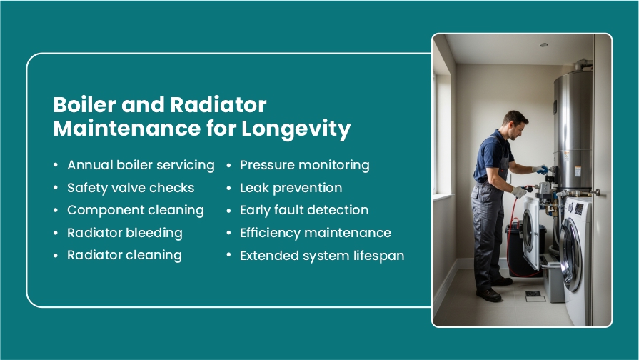 Regular maintenance is key to keeping your boiler and radiator systems running smoothly and extending their lifespan. Proper care prevents breakdowns, improves efficiency, and reduces the need for costly repairs down the line. Here’s how to keep your system in top condition: