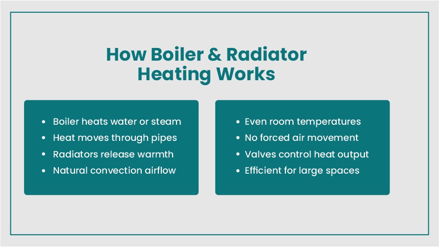 Because the heat is distributed gradually and evenly, boiler and radiator systems are often considered a reliable long-term heating option, especially for homes that prioritize comfort, quiet operation, and stable temperatures.