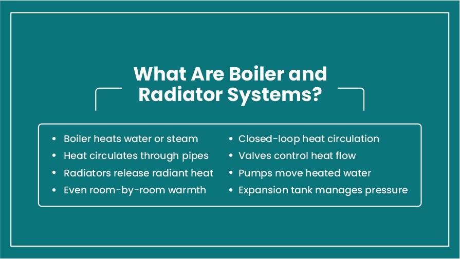 Boiler and radiator heating systems work by heating water or creating steam at a central boiler and circulating that heat through radiators installed throughout the home. The system operates as a continuous loop, ensuring steady and controlled heat delivery to each room.