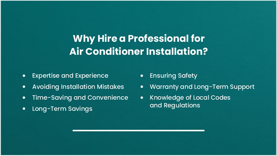 Hiring a professional ensures your air conditioner is installed properly and can save you money in the long run by improving efficiency, prolonging the lifespan of the system, and preventing costly repairs.