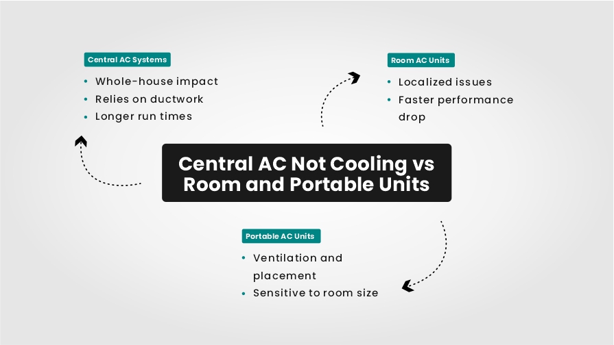 In general, central systems are designed to cool an entire home evenly, while room and portable units focus on limited areas. Because of this, cooling issues in a whole-house system often feel more widespread, whereas smaller units usually show problems in a single room or zone.