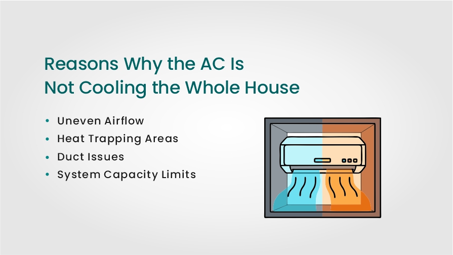 When airflow is uneven, the AC may cool nearby rooms quickly while distant or enclosed rooms receive weak airflow. Over time, this imbalance makes it feel like the AC cannot cool the whole house, even though it is actively running.
