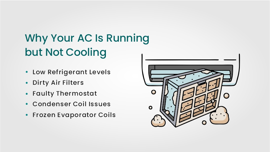 When your AC is running but not lowering the temperature, it usually means airflow is present but heat removal is failing. This can happen due to dirty coils, low refrigerant levels, restricted airflow, or thermostat miscalibration. The system may run continuously, but without proper heat transfer, indoor temperature will not drop effectively. If the AC runs for more than 30–45 minutes without reaching the set temperature, it indicates reduced cooling efficiency rather than a complete failure.