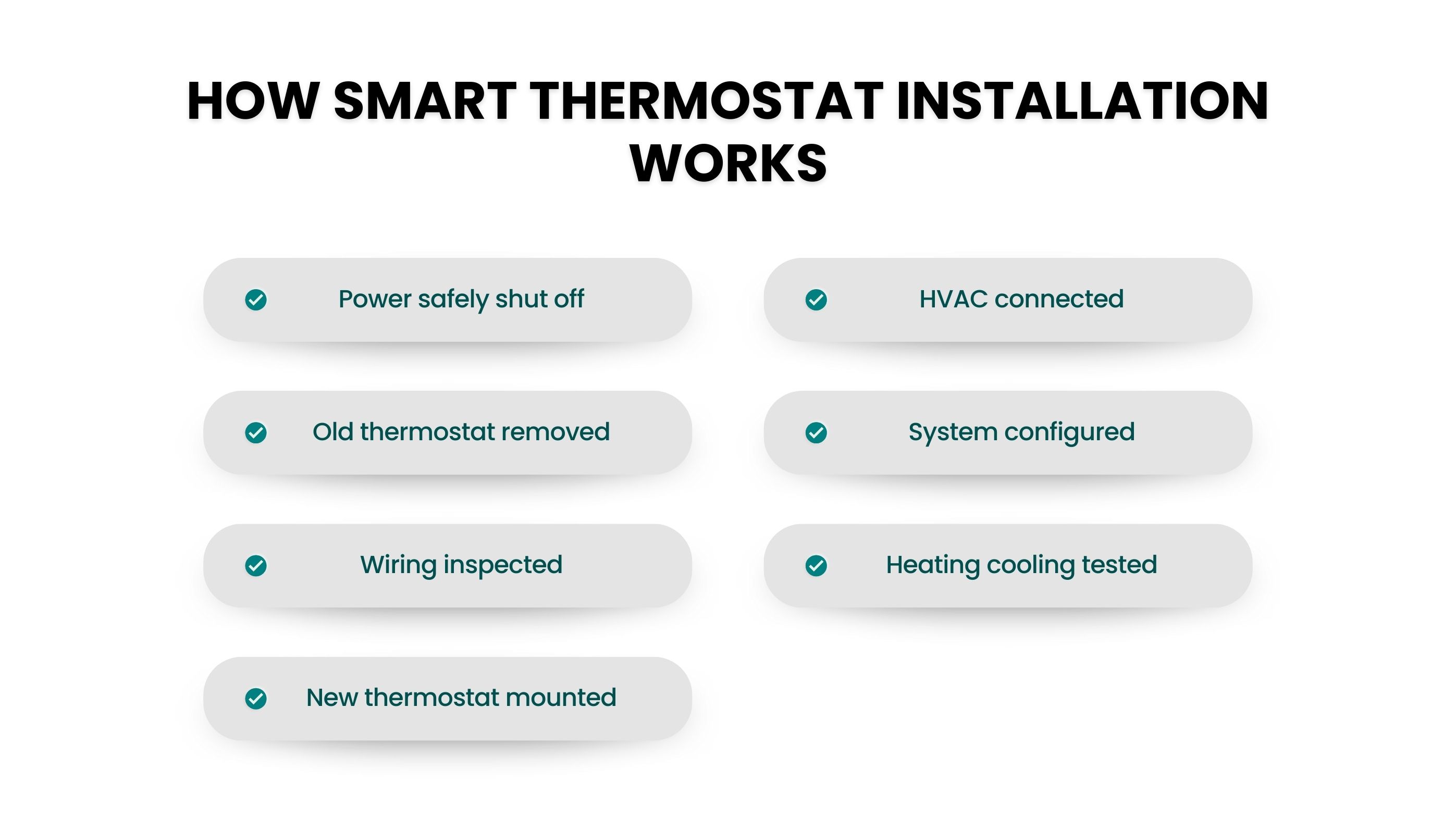 During smart home thermostat installation, the system is configured to match your HVAC type. Once connected, the thermostat continuously communicates with the equipment to optimize comfort, timing, and energy use.