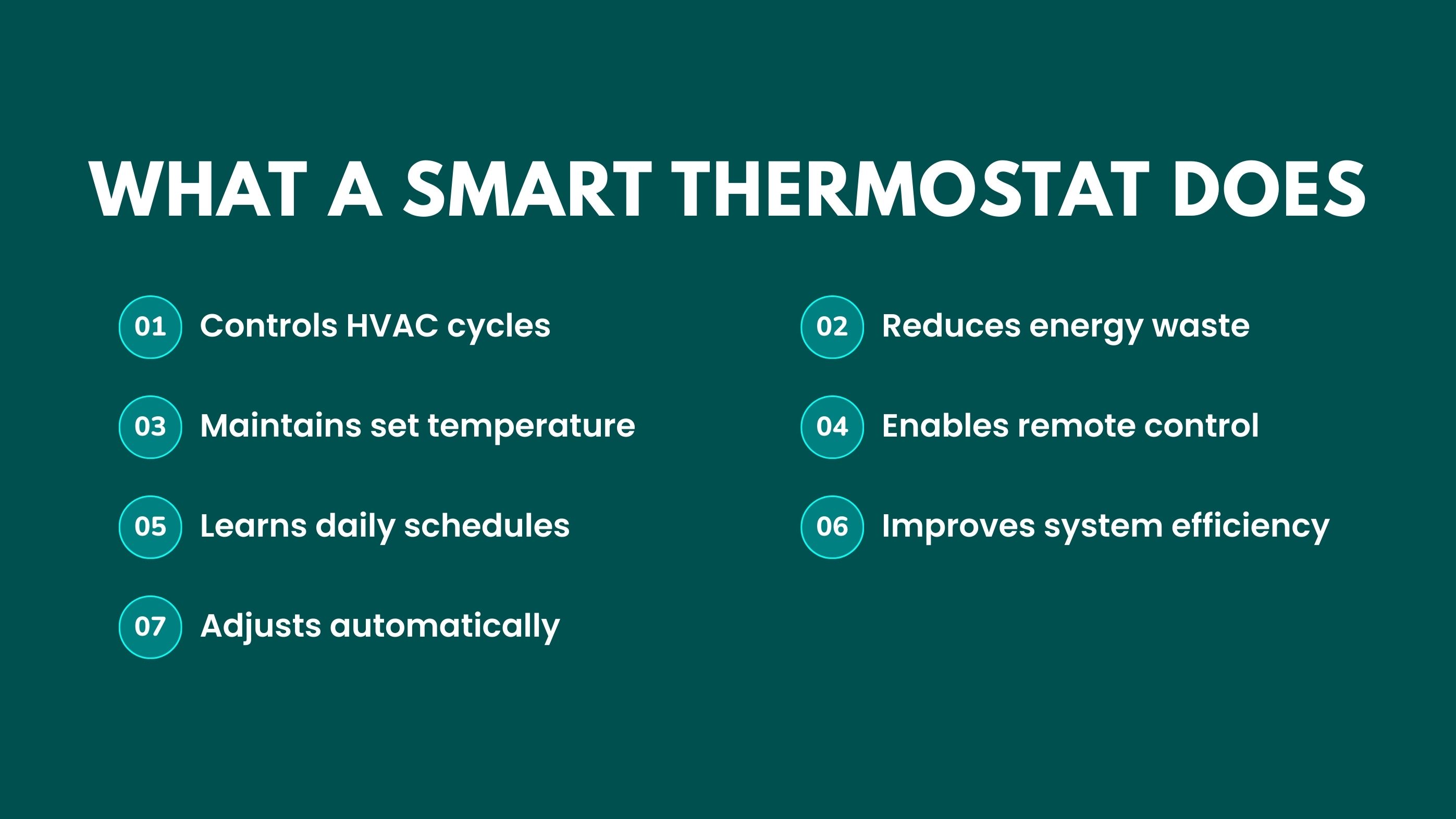 A smart thermostat works as the control center for your HVAC system. It sends signals to heating and cooling equipment to start, stop, or adjust output based on indoor temperature, schedules, and system behavior. Unlike basic thermostats, it manages cycle timing more precisely, helping the HVAC system run efficiently and maintain steady comfort.