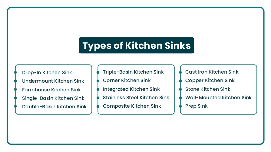 There are several types of kitchen sinks, each offering unique features that cater to different styles, functions, and installation preferences. Here are the most common kitchen sink types: