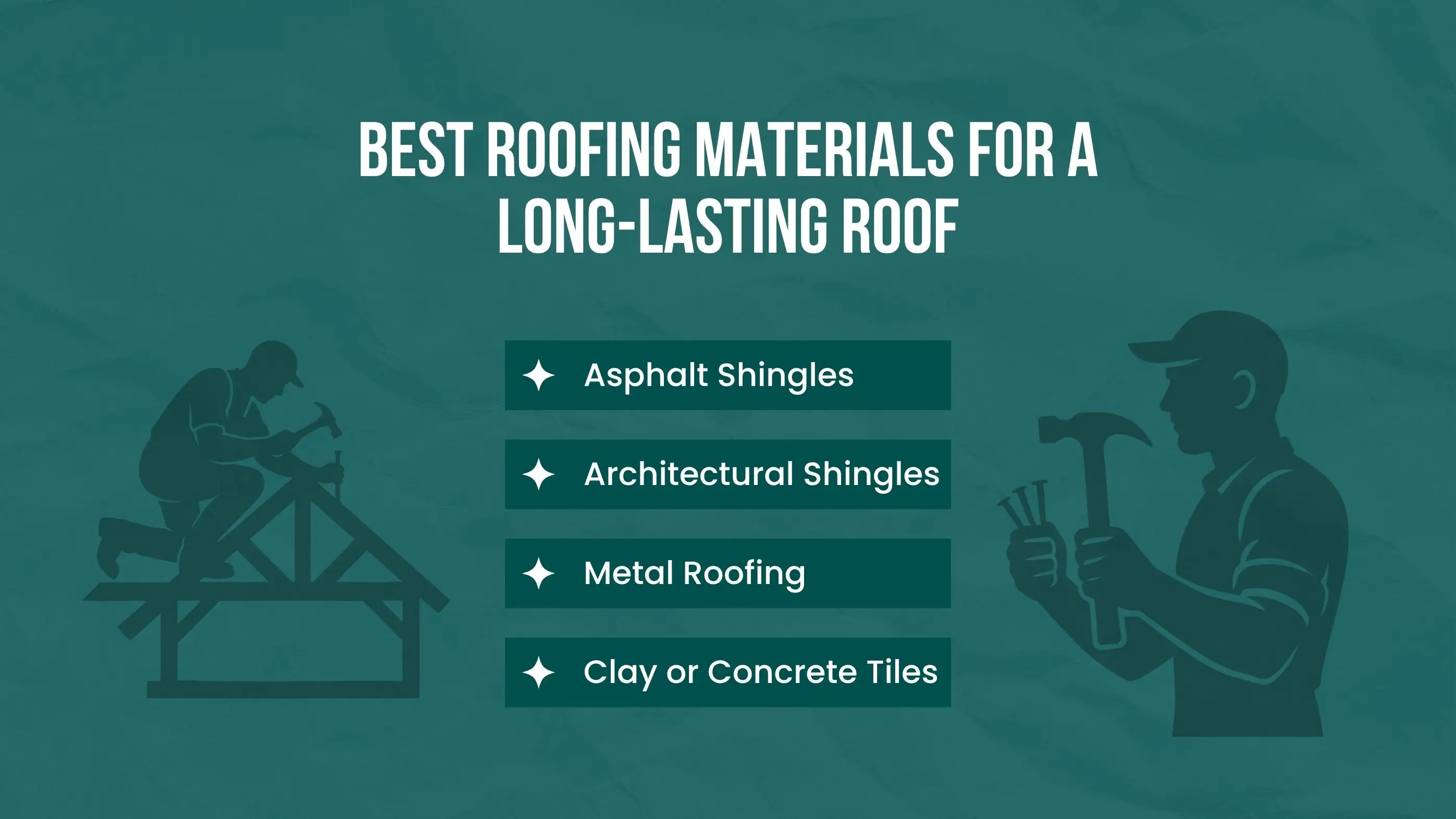 • Architectural Shingles is a premium type of asphalt shingle with a thicker, layered look. More durable and wind-resistant than standard shingles. Its lifespan is about 25–35 years.