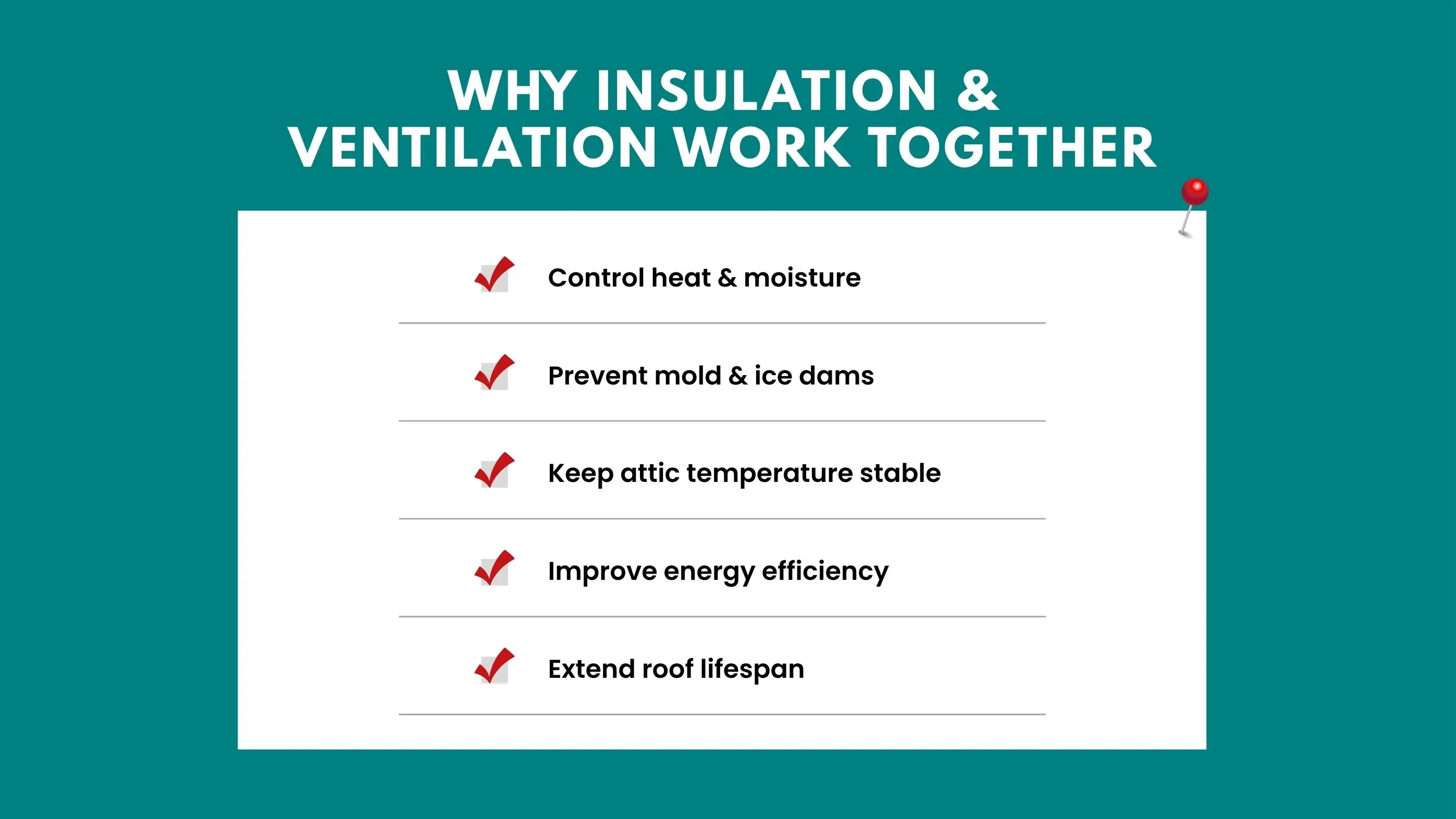 Insulation slows heat transfer, while ventilation allows trapped air and moisture to escape. When they work together, your roof assembly stays dry and energy-efficient. Warm air rises through a process called the stack effect. If insulation is weak, it escapes into the attic, causing snowmelt or excessive summer heat.