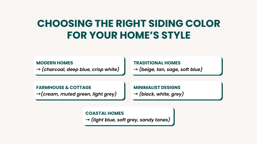 Every home style has color families that naturally complement its architecture. Choosing a siding color that fits the home’s design helps maintain balance and creates a cohesive, intentional exterior. When the color matches the structure, trim, and roof style, the home feels more complete and visually harmonious.