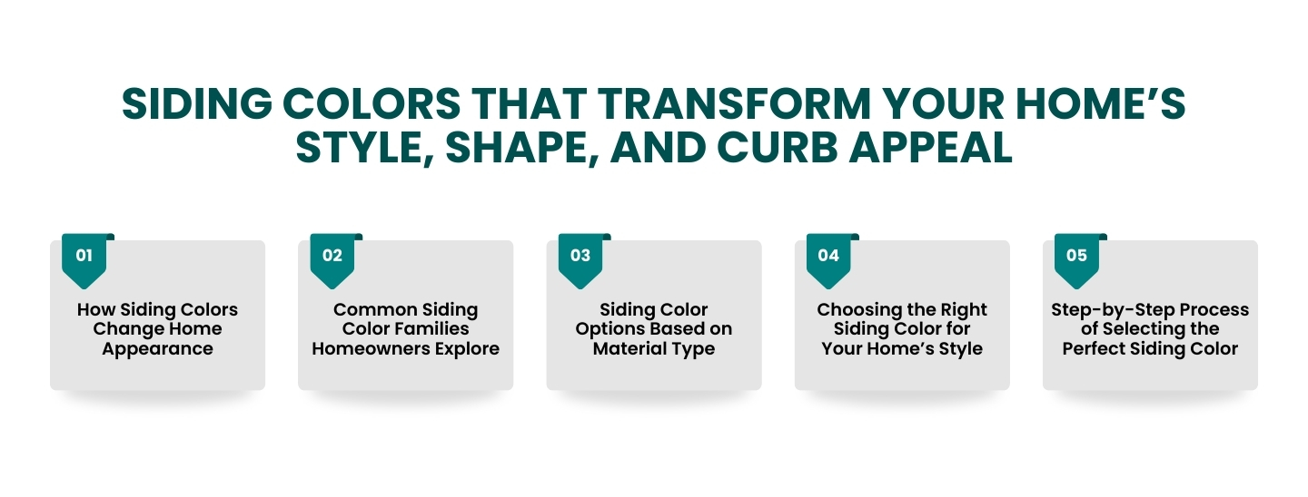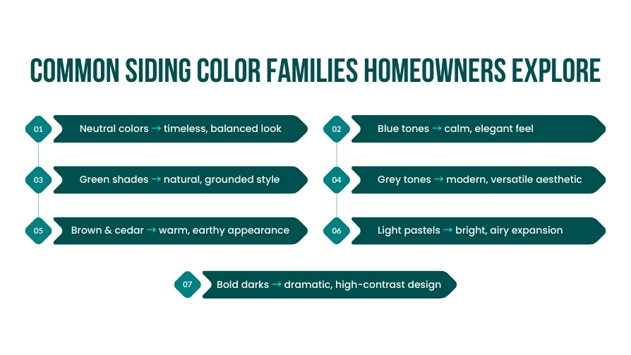 Homeowners explore different siding color families to find a look that matches their home’s architecture, surroundings, and personal style. Each color group brings its own character, whether it's calm, bold, warm, or modern. Understanding these families helps homeowners choose palettes that stay beautiful for years.