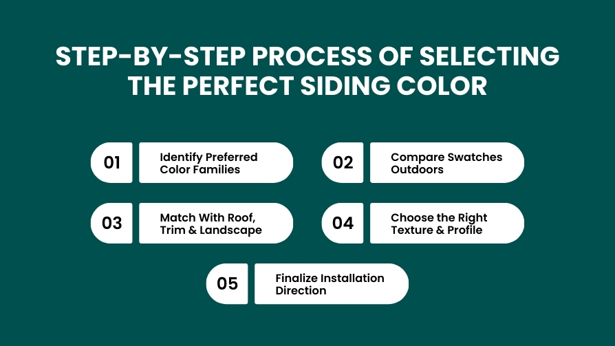 Choosing the perfect siding color is a thoughtful process that blends personal style with architectural balance. Each step helps homeowners narrow down choices, see how colors behave in real lighting, and understand how different textures and profiles influence the final look. Following this step-by-step approach ensures the final color feels intentional, timeless, and visually harmonious from every angle.