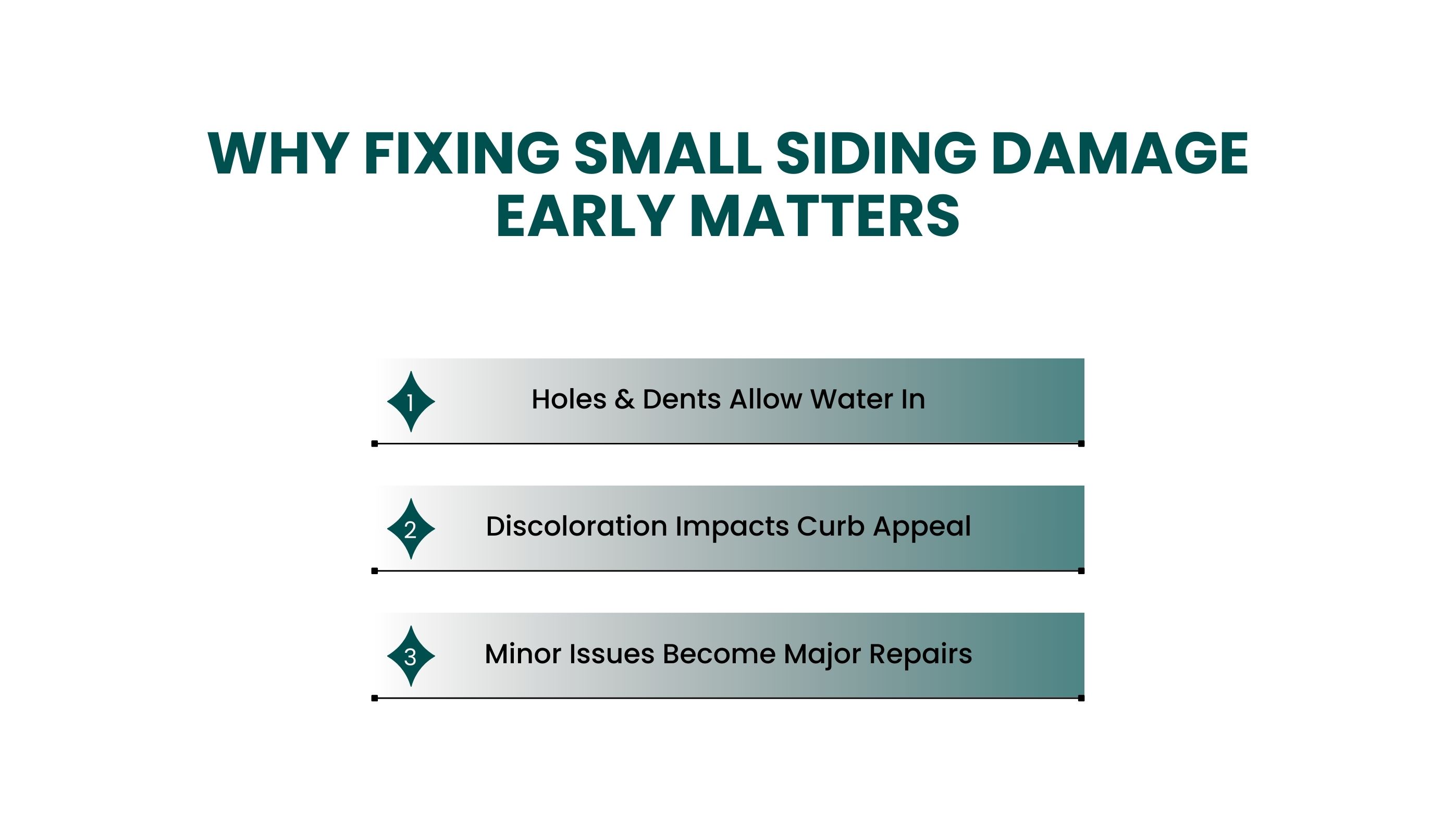 What starts as a small issue, like a single crack or dent, can quickly turn into a major repair if left untreated. Small holes can expand, cracks can spread, and water damage can worsen, requiring entire sections of siding to be replaced. Fixing small damage as soon as it appears helps avoid the costs of major repairs down the road, which can be 3–4 times more expensive than a quick patch.