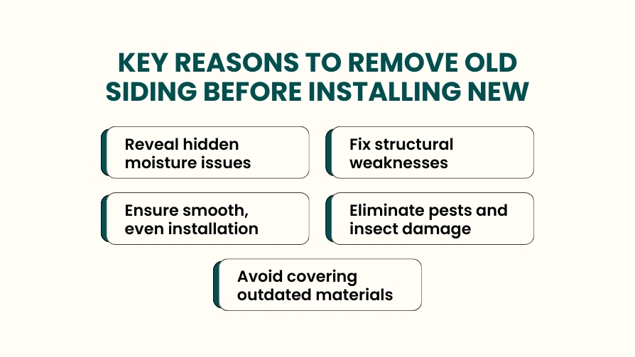 Removal ensures that underlying problems like pests, moisture damage, or structural issues are addressed before the new siding is installed, preventing long-term issues.
