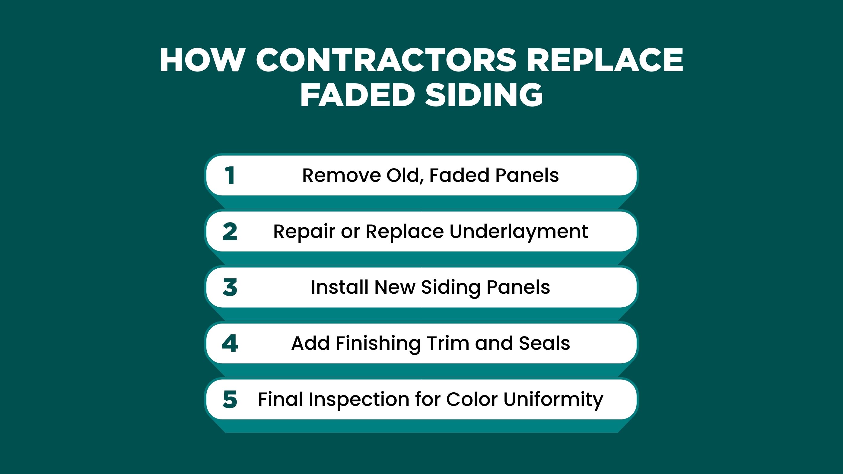Replacing faded siding means removing worn exterior panels and installing new ones that restore protection and appearance. Faded siding usually appears after 15–30 years, depending on material and sun exposure, and once color breakdown starts, moisture absorption increases by 20–40%. Replacing siding at this stage helps prevent hidden wall damage and extends the home’s exterior lifespan by decades.