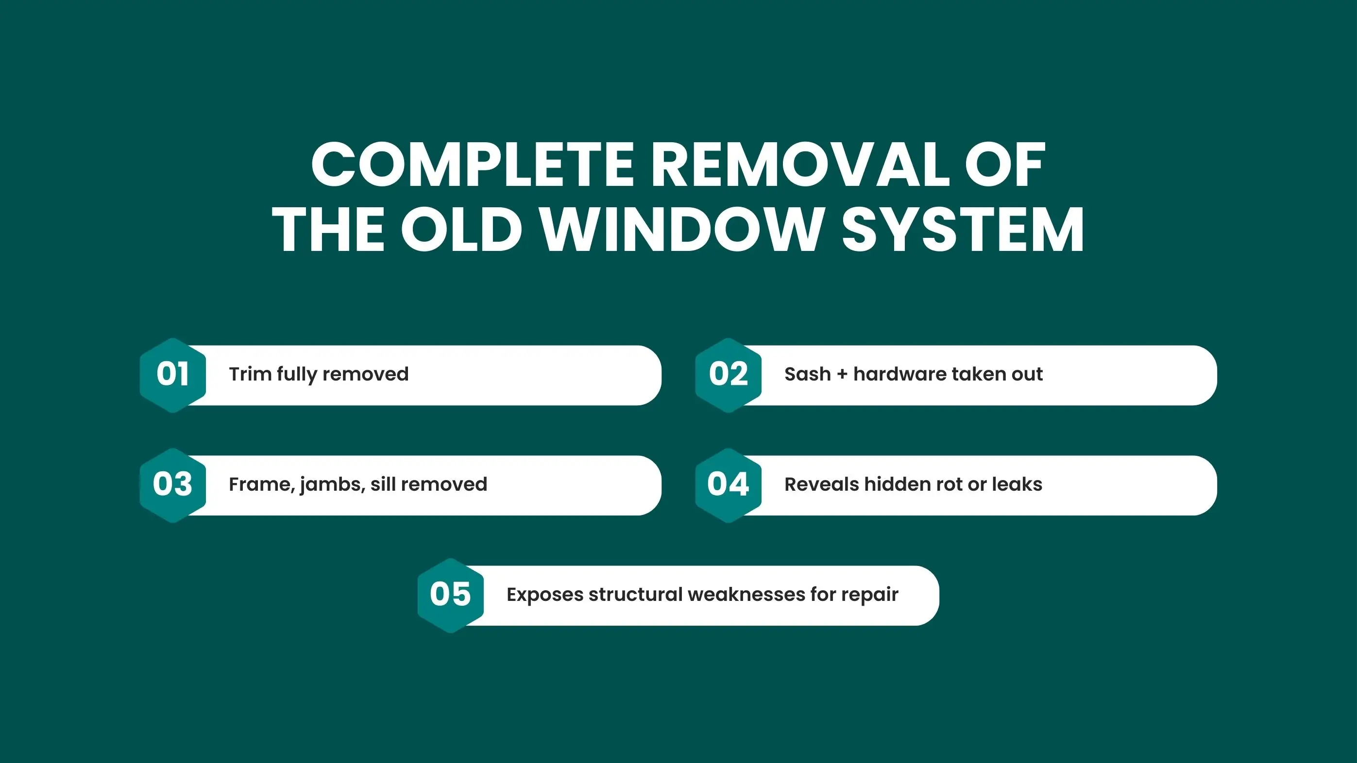By removing everything, the installer can check for hidden rot, moisture intrusion, pest damage, or structural weakness that may not be visible from the outside. Hidden damage is one of the biggest causes of drafts, leaks, and window instability. Full removal exposes all problem areas so they can be fixed properly, not covered up.