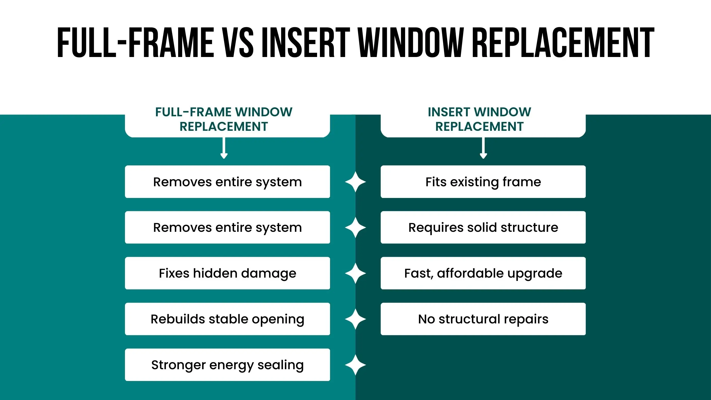 Full-frame and insert (pocket) window replacements serve different purposes. Insert replacements simply place a new window inside the existing frame, while full-frame installations remove everything and rebuild the opening from zero. The method you choose depends on the condition of the frame and the performance you expect from your new windows.