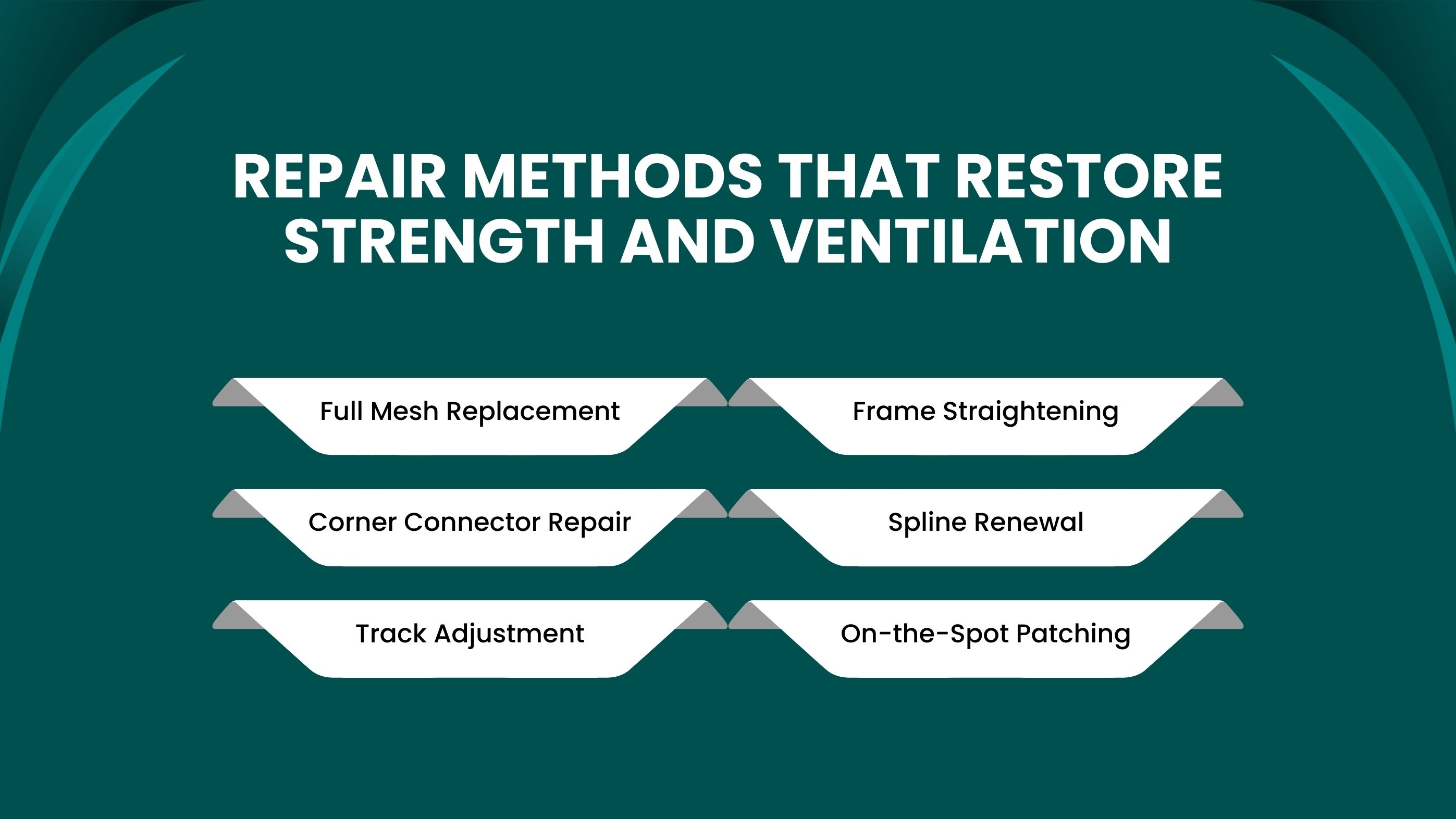 When spline channels warp or crack, the mesh can’t stay locked in place. Repair may involve reshaping the channel, reinforcing it, or replacing the affected frame section so the mesh installs securely.