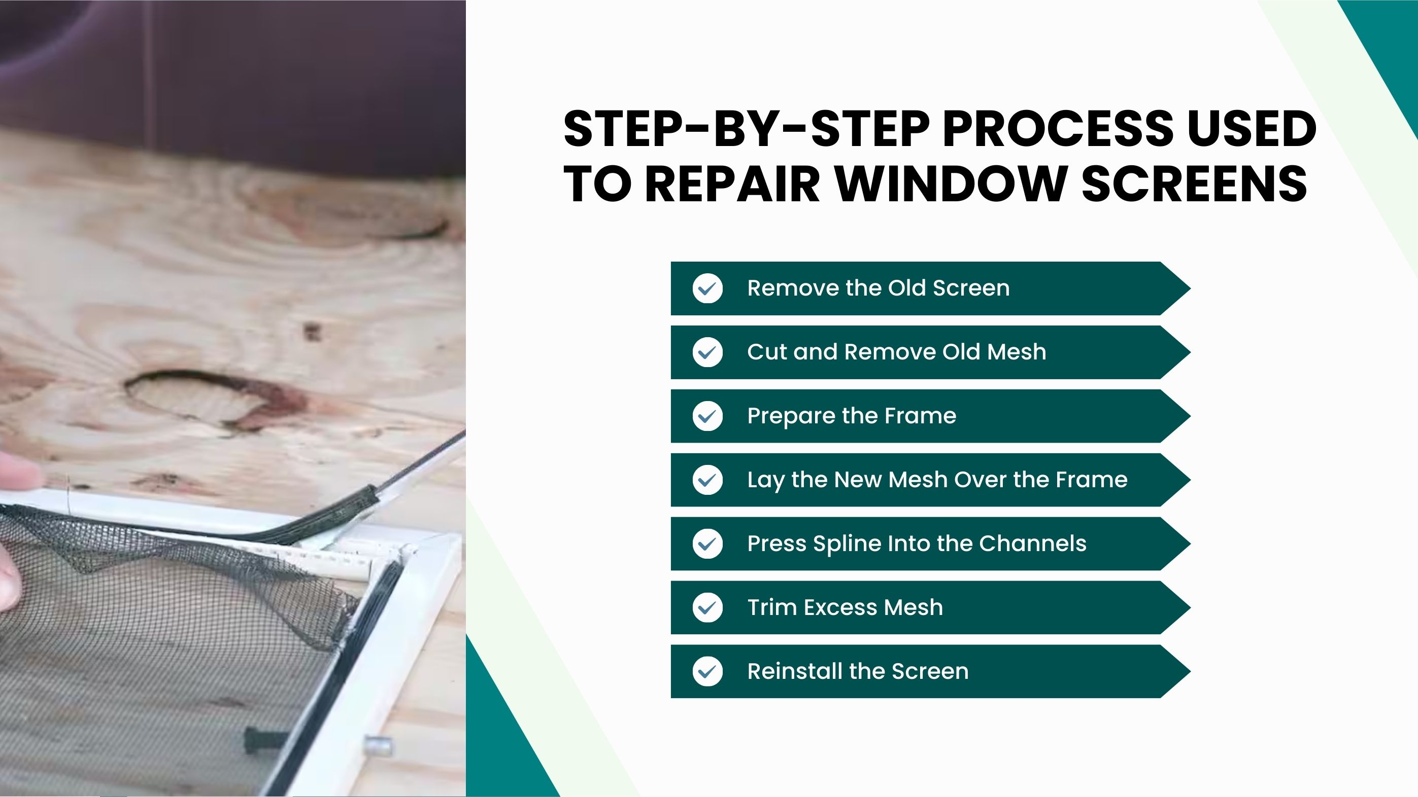 Repairing a window screen is a straightforward process when each step is done carefully. This method restores tight mesh, strengthens the frame, and ensures the screen fits securely back into the window. The detailed steps below explain exactly how professionals and DIY homeowners repair screens properly.