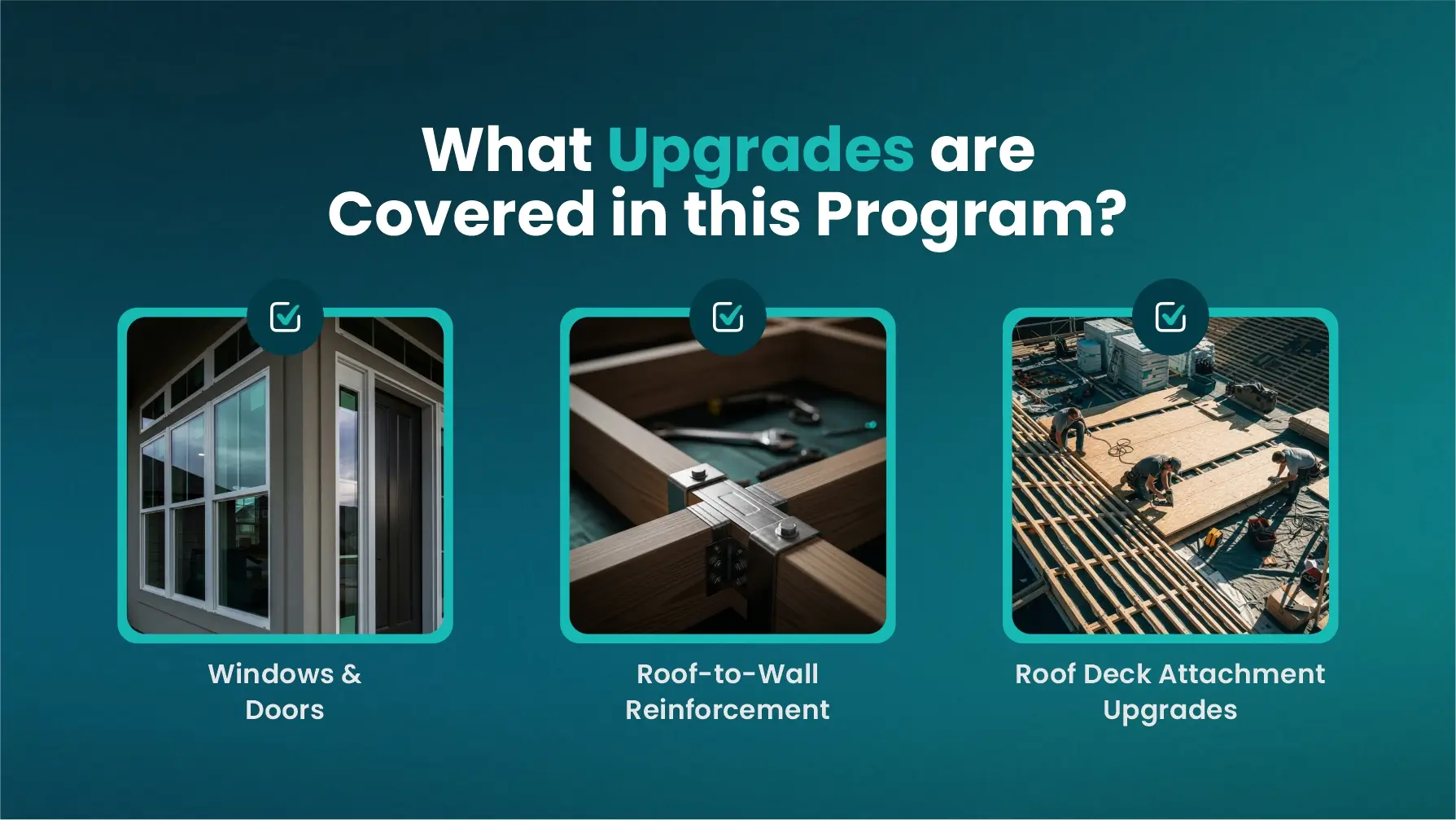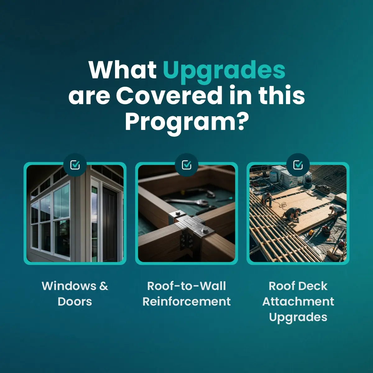 This program focuses on essential upgrades designed to improve your home’s ability to survive Florida’s harsh storm settings. Here are some of the common upgrades covered under the law.